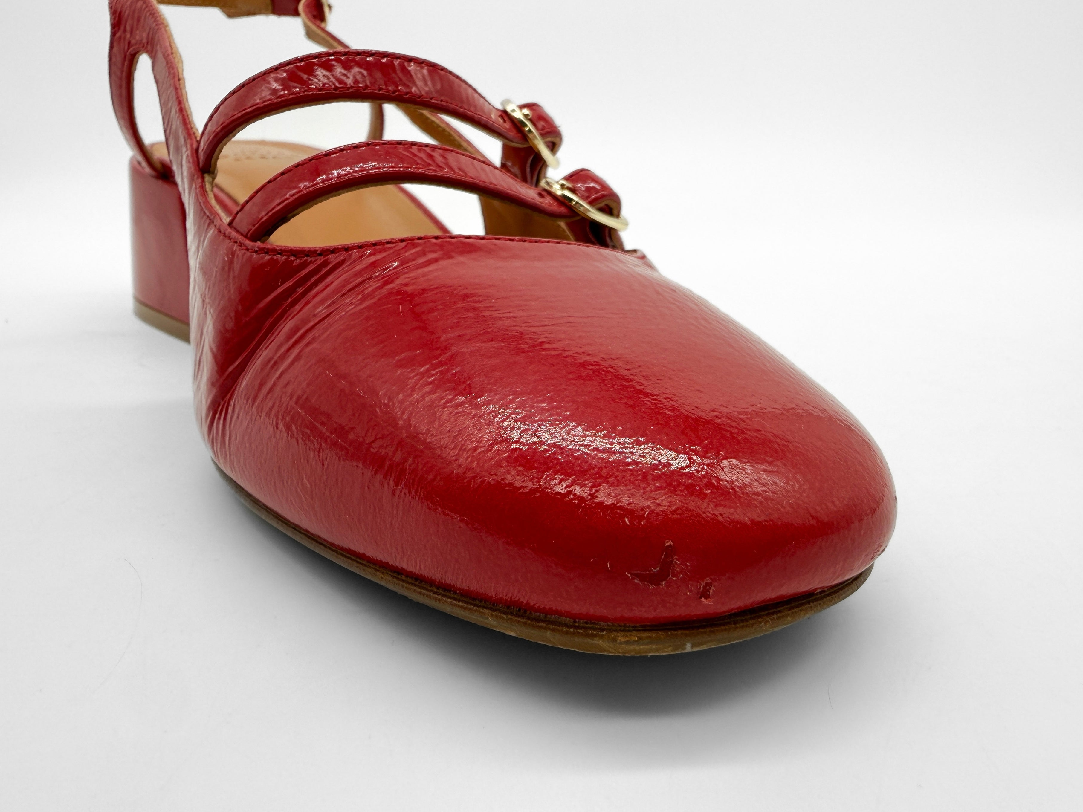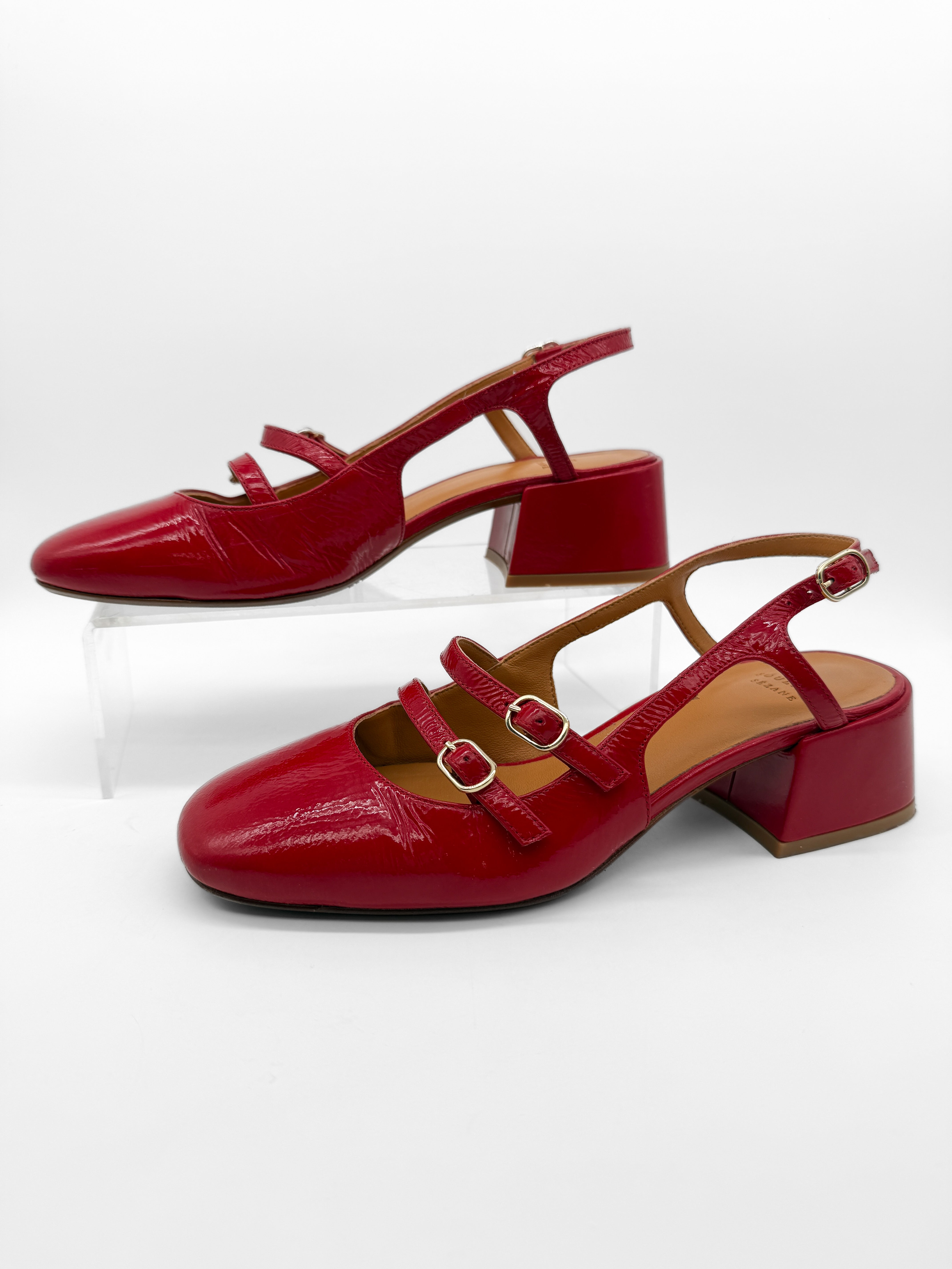 Materials: patent leather exterior, leather lining and insole, rubber outsole