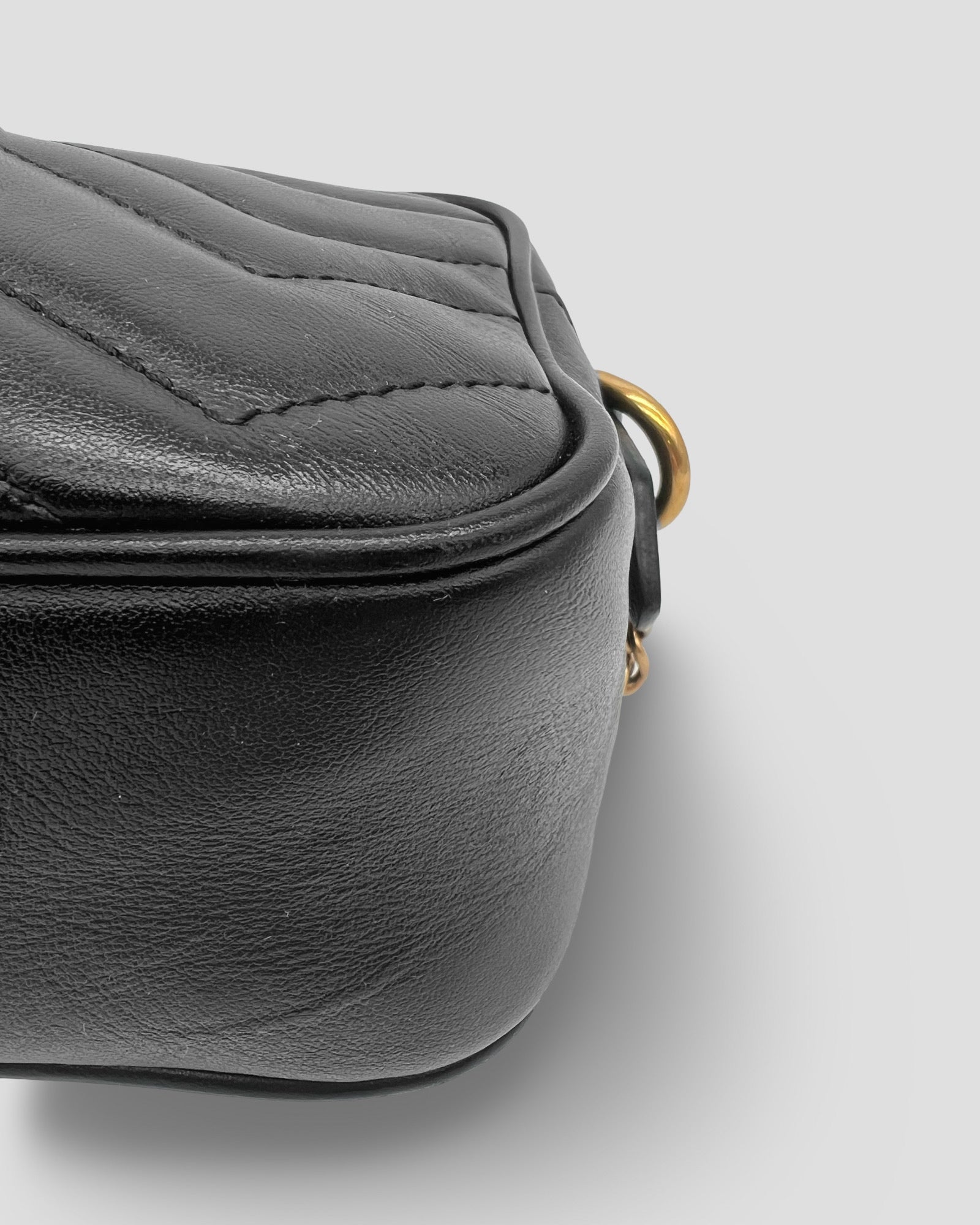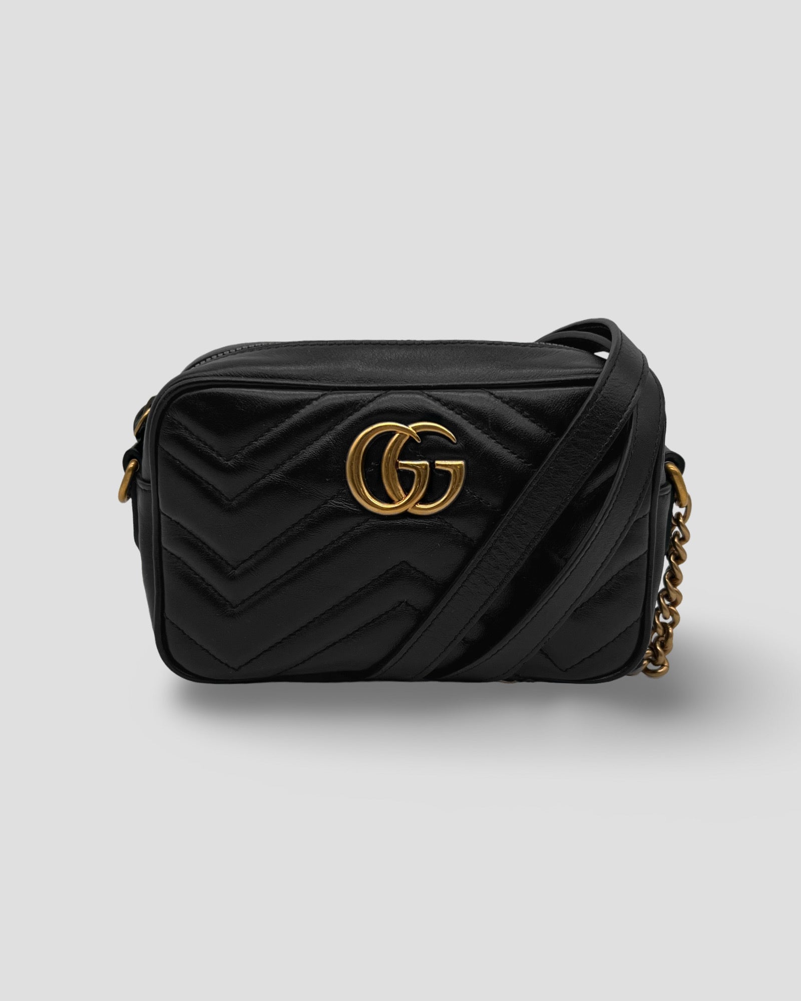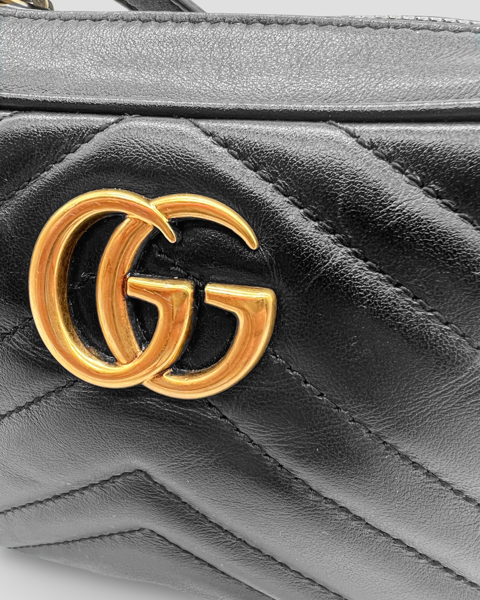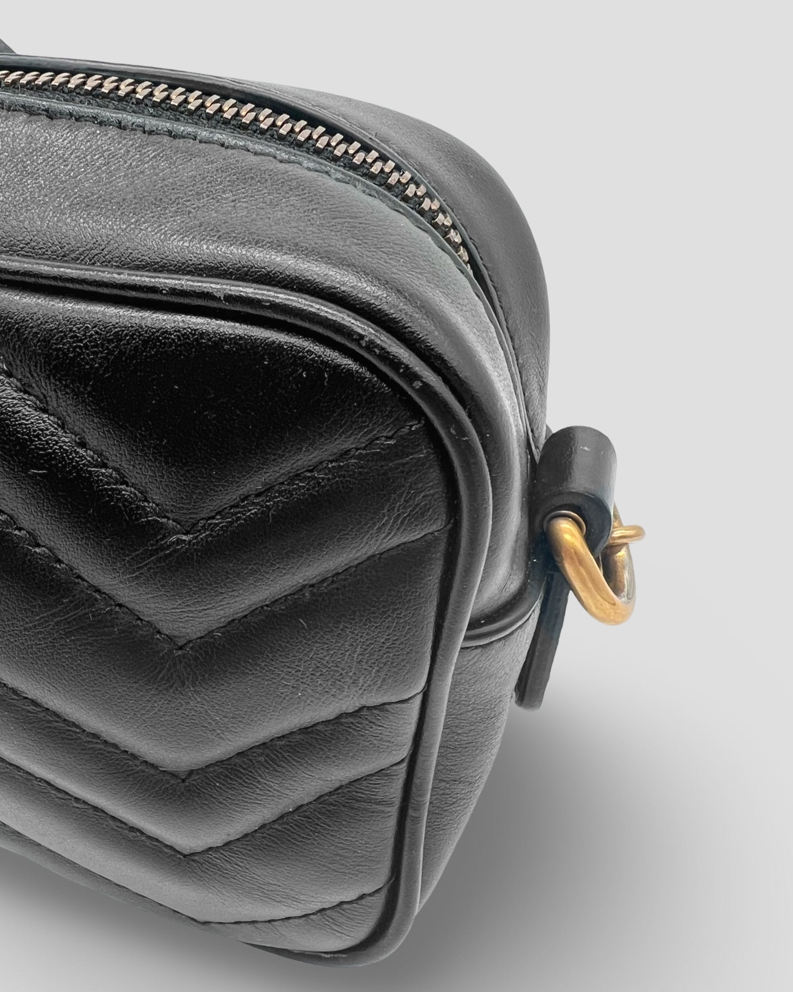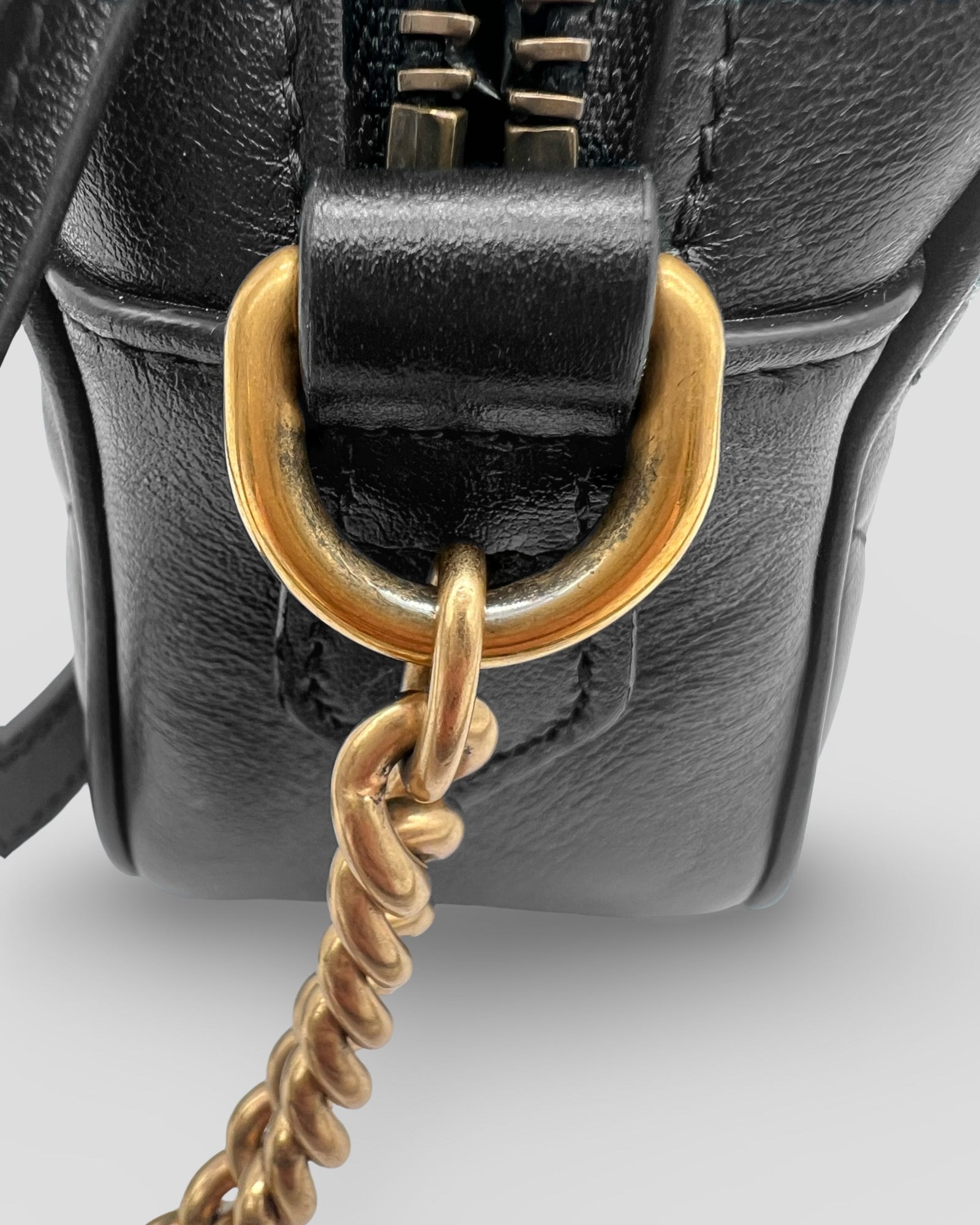 Details: The mini GG Marmont chain shoulder bag has a softly structured shape and a zip top closure with Double G hardware. The chain shoulder strap has a leather shoulder detail. The camera bag is made in matelassรฉ leather with a chevron design and GG on the back.