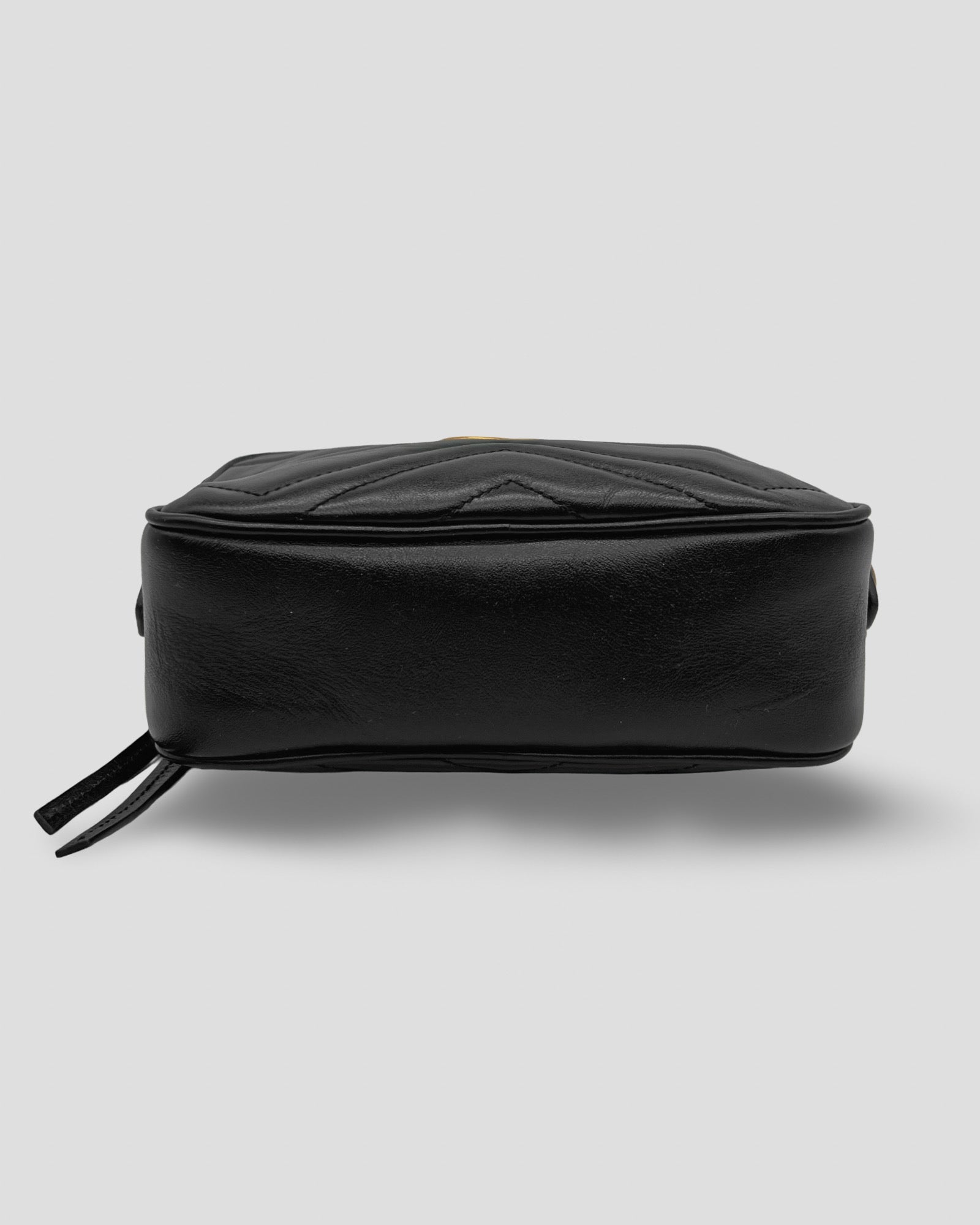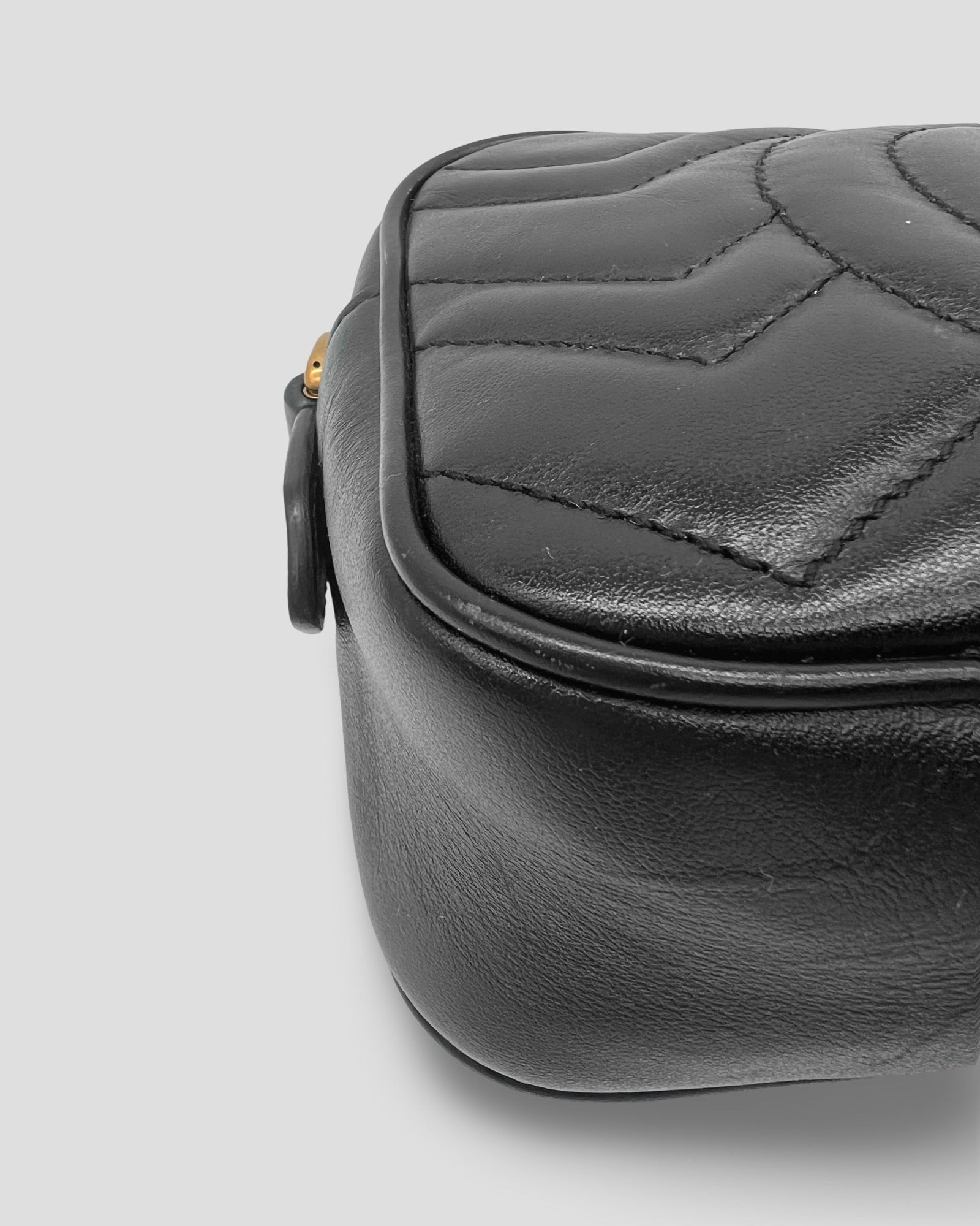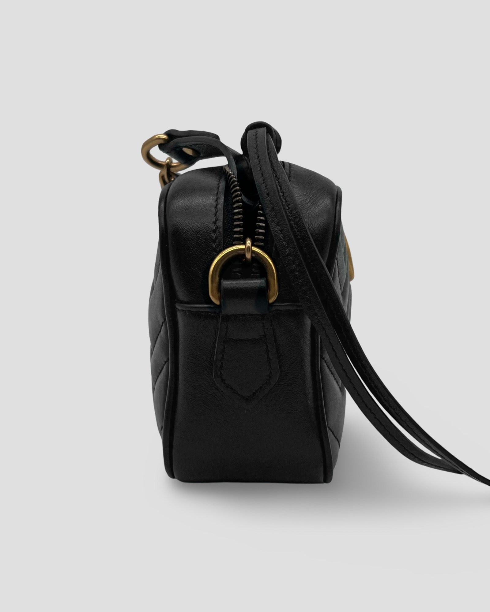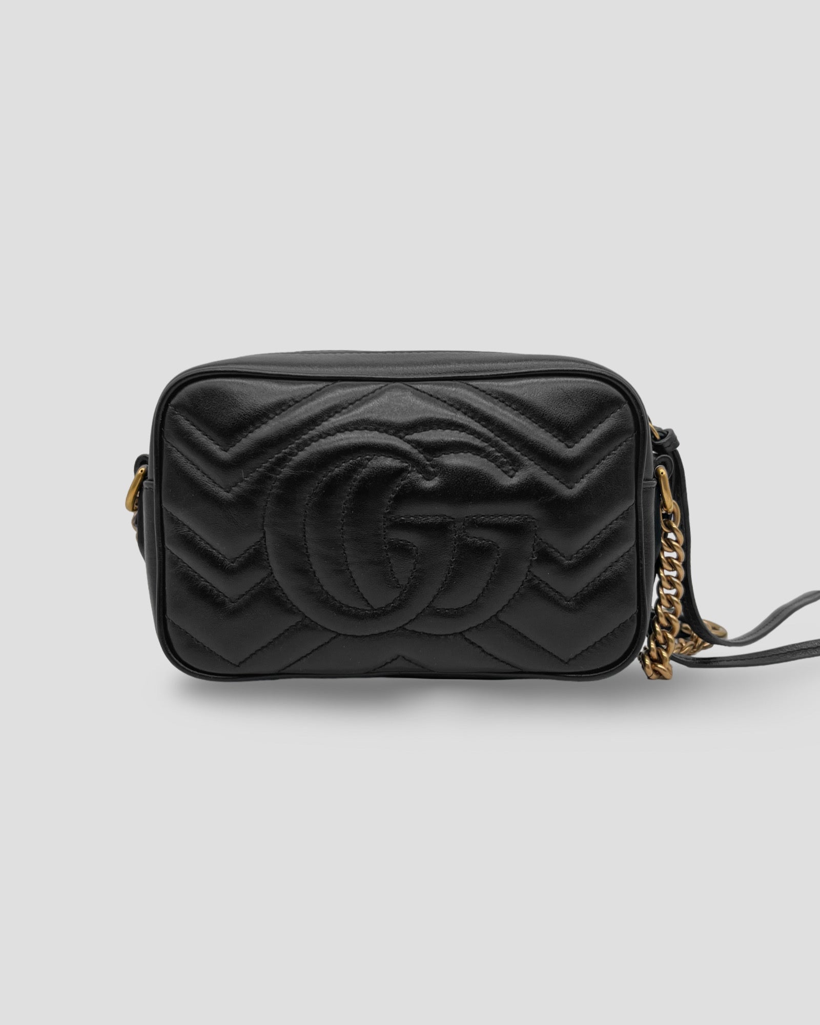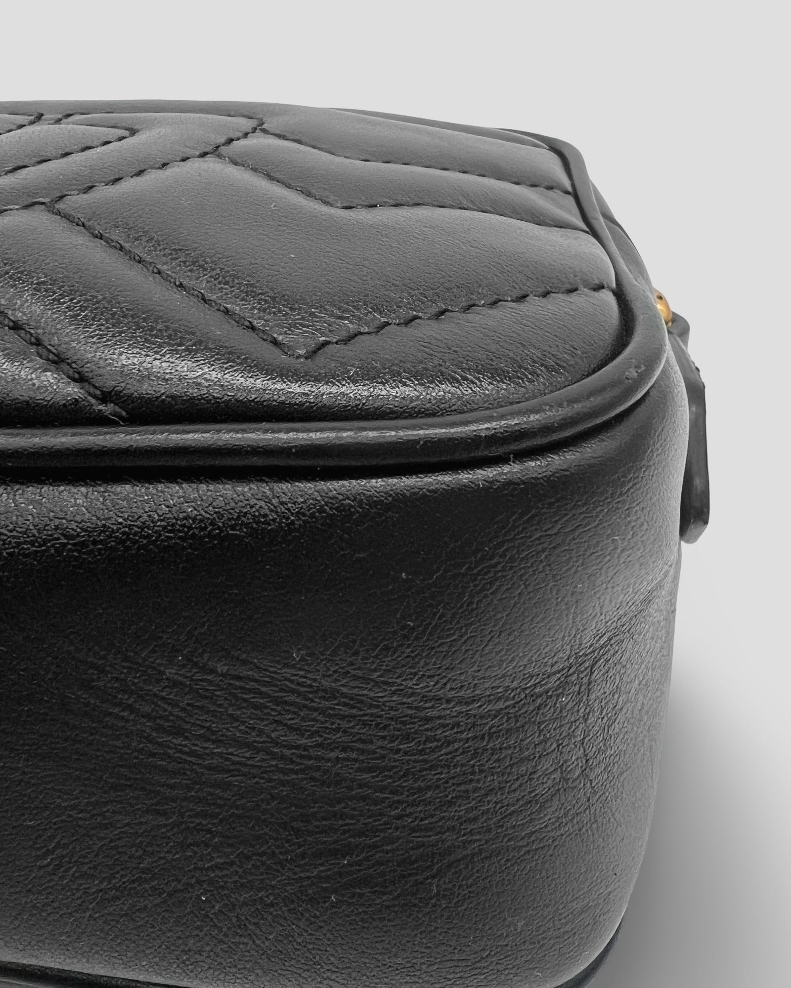 Details: The mini GG Marmont chain shoulder bag has a softly structured shape and a zip top closure with Double G hardware. The chain shoulder strap has a leather shoulder detail. The camera bag is made in matelassรฉ leather with a chevron design and GG on the back.