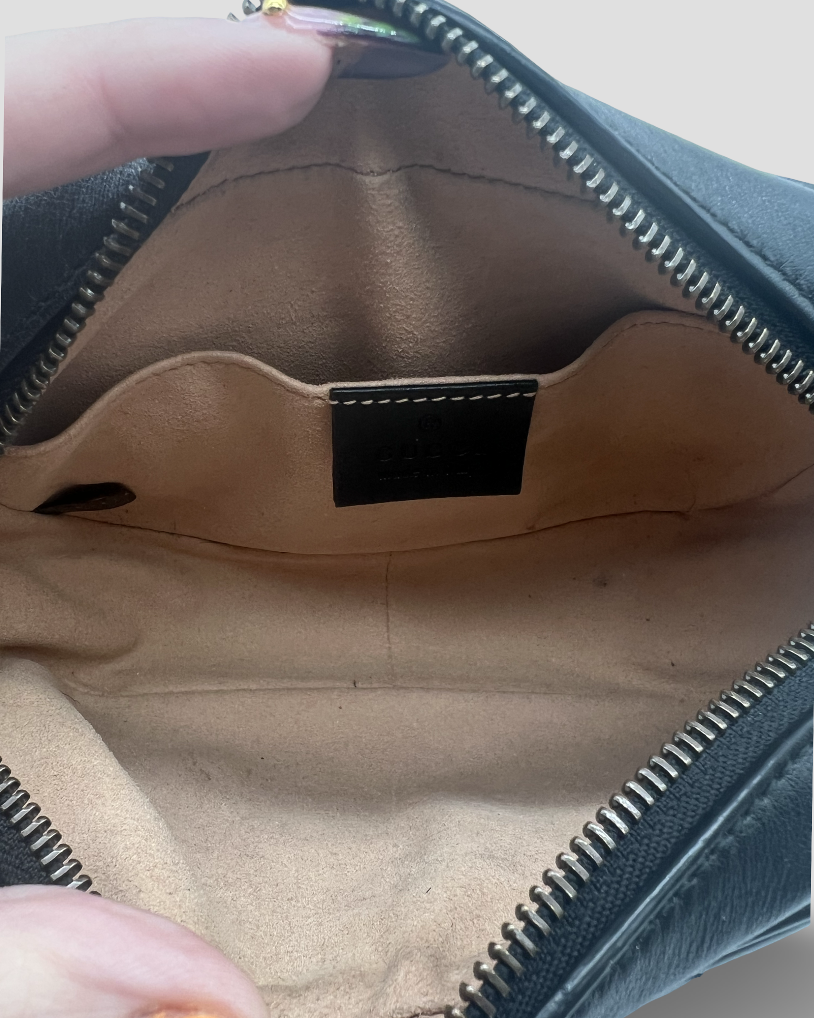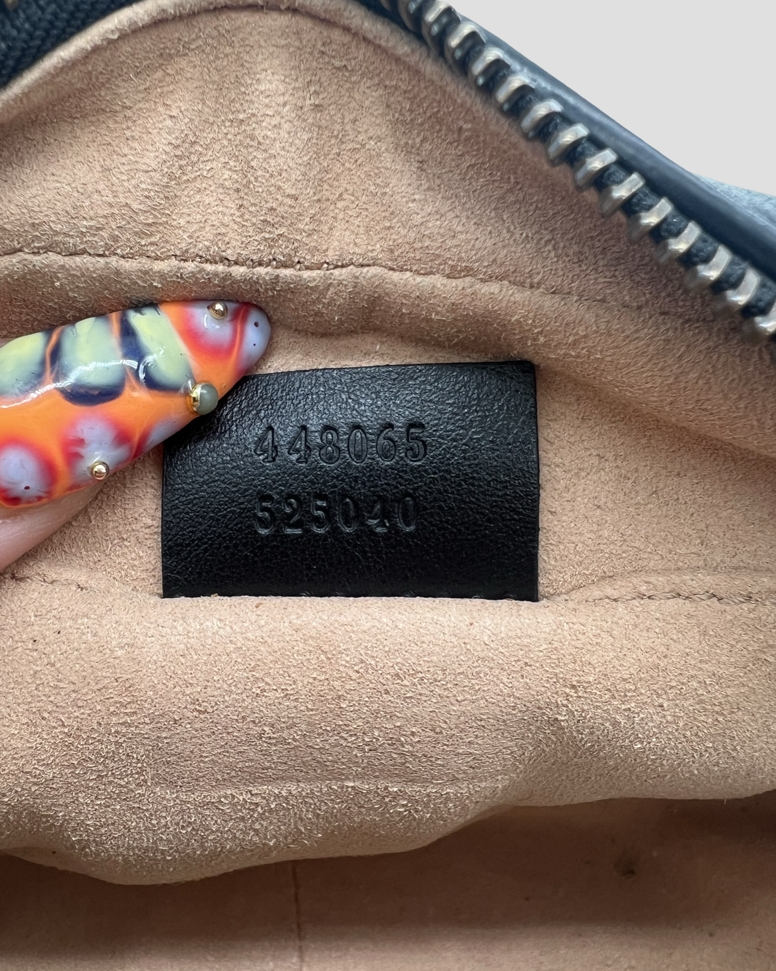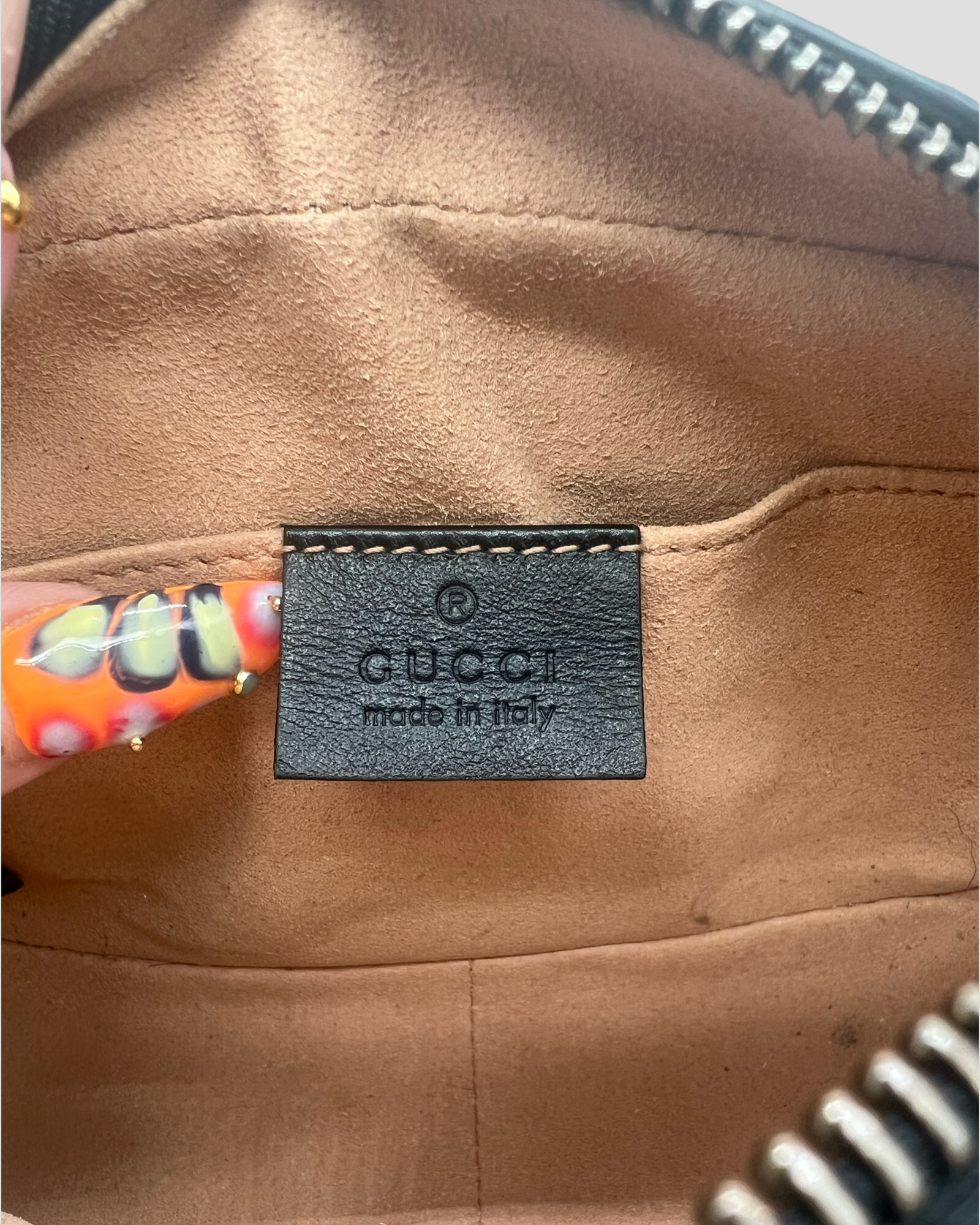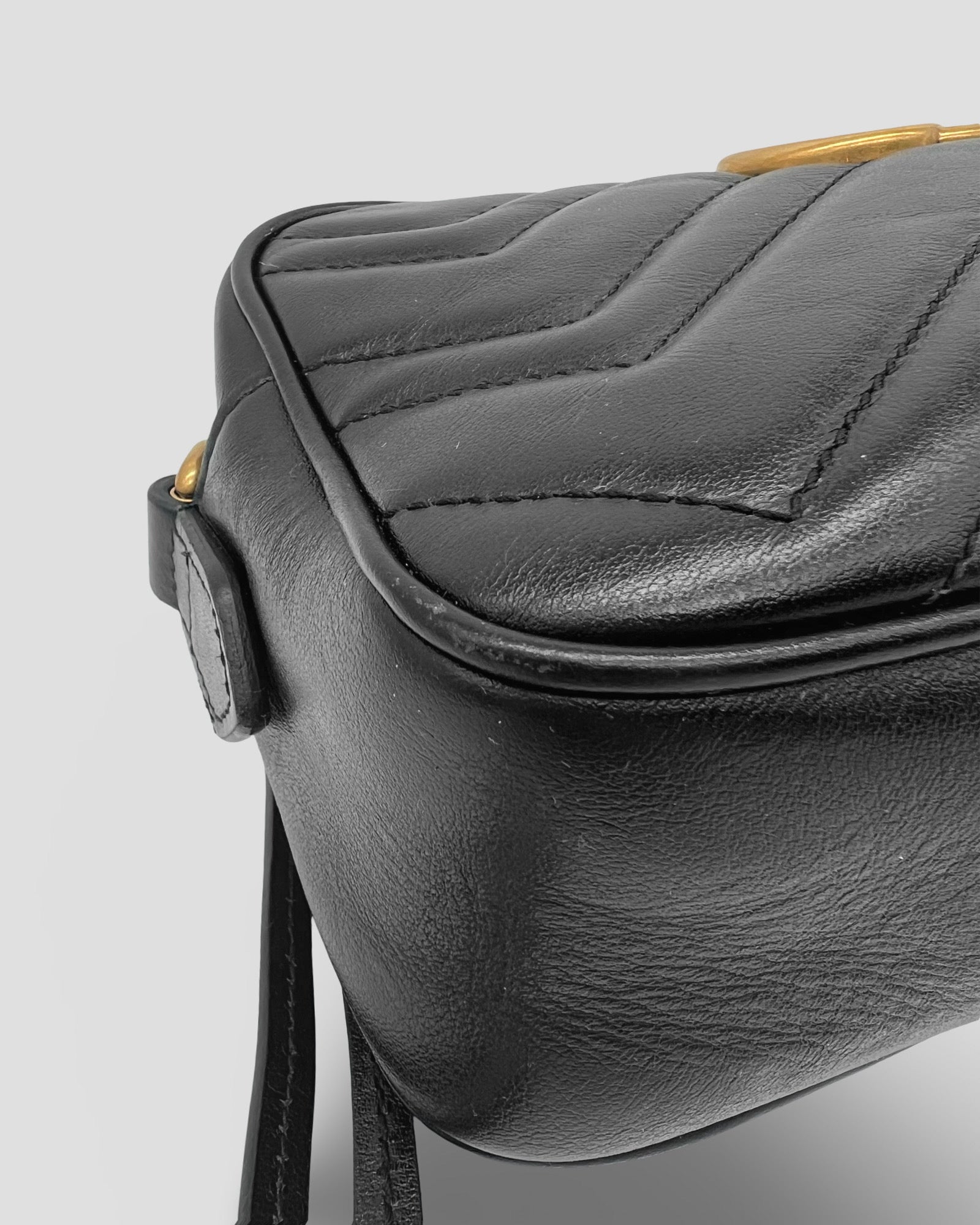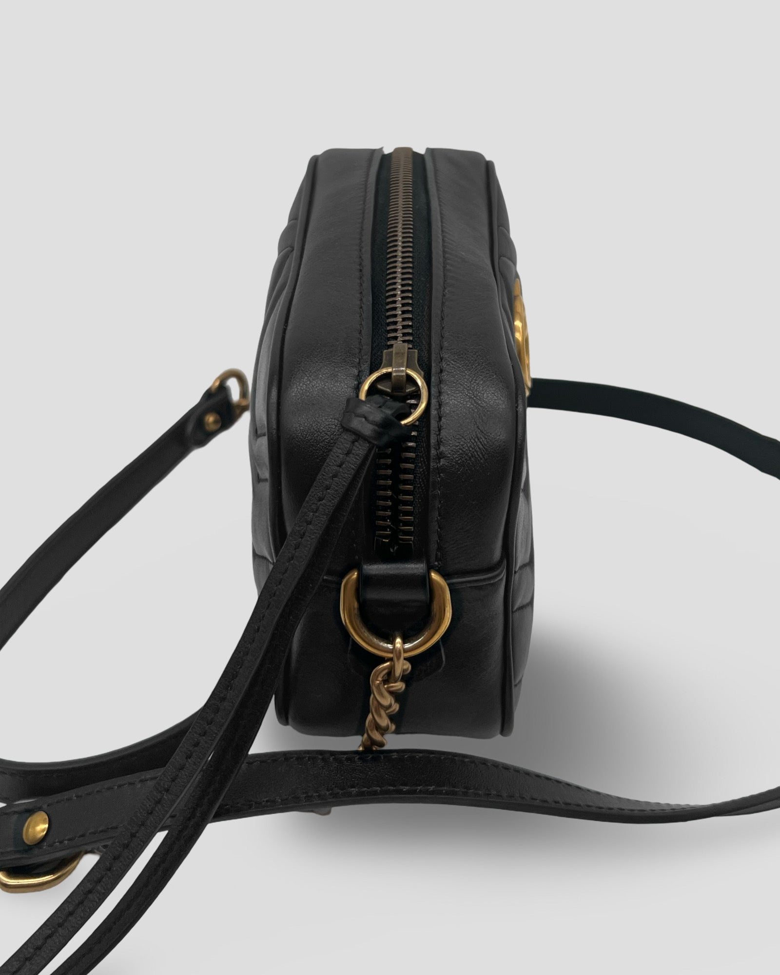 Details: The mini GG Marmont chain shoulder bag has a softly structured shape and a zip top closure with Double G hardware. The chain shoulder strap has a leather shoulder detail. The camera bag is made in matelassรฉ leather with a chevron design and GG on the back.