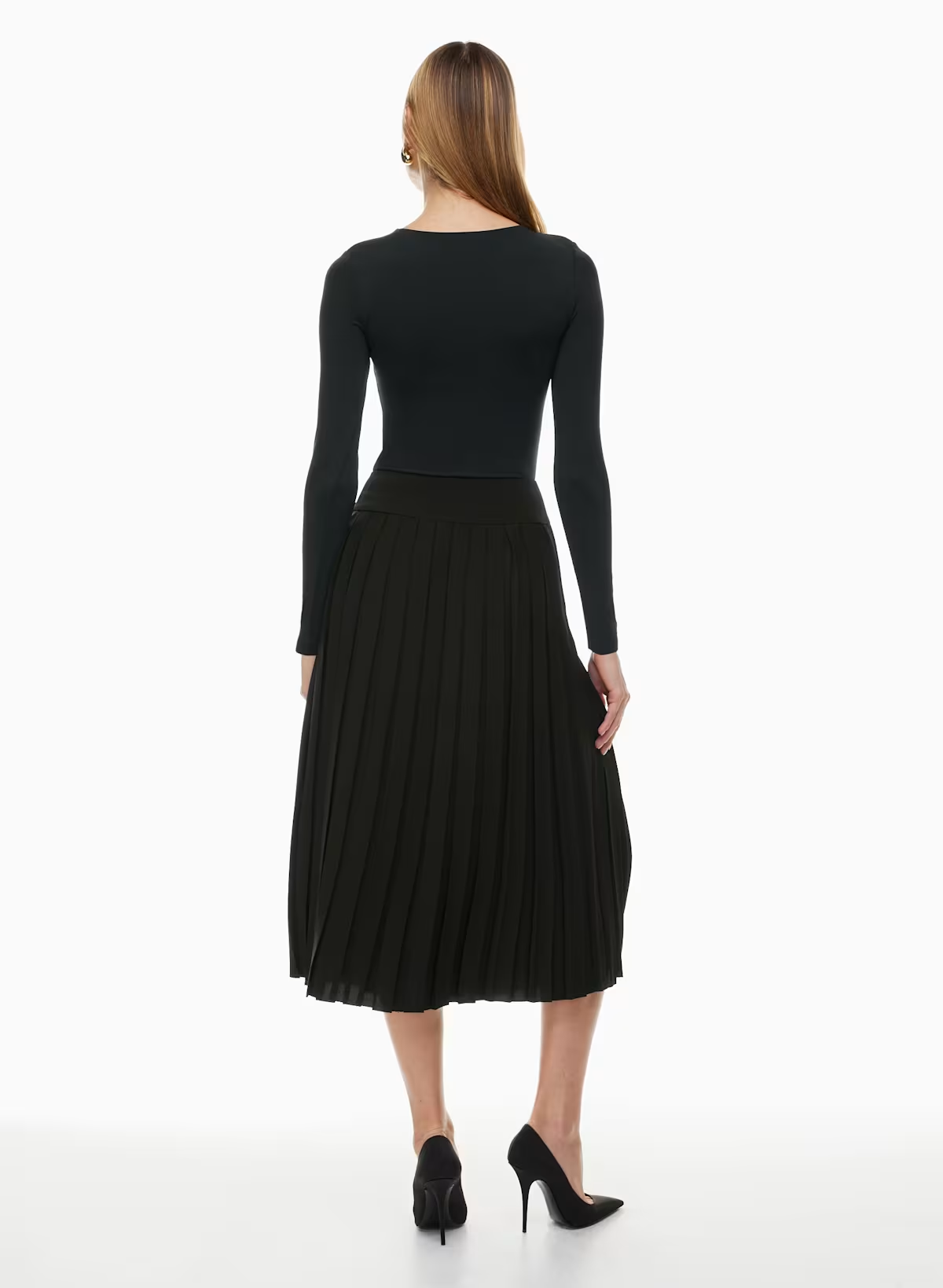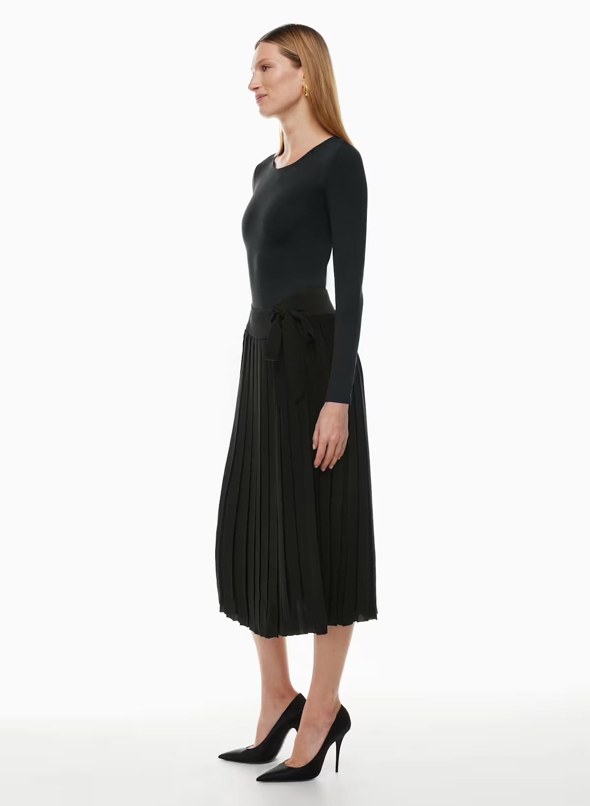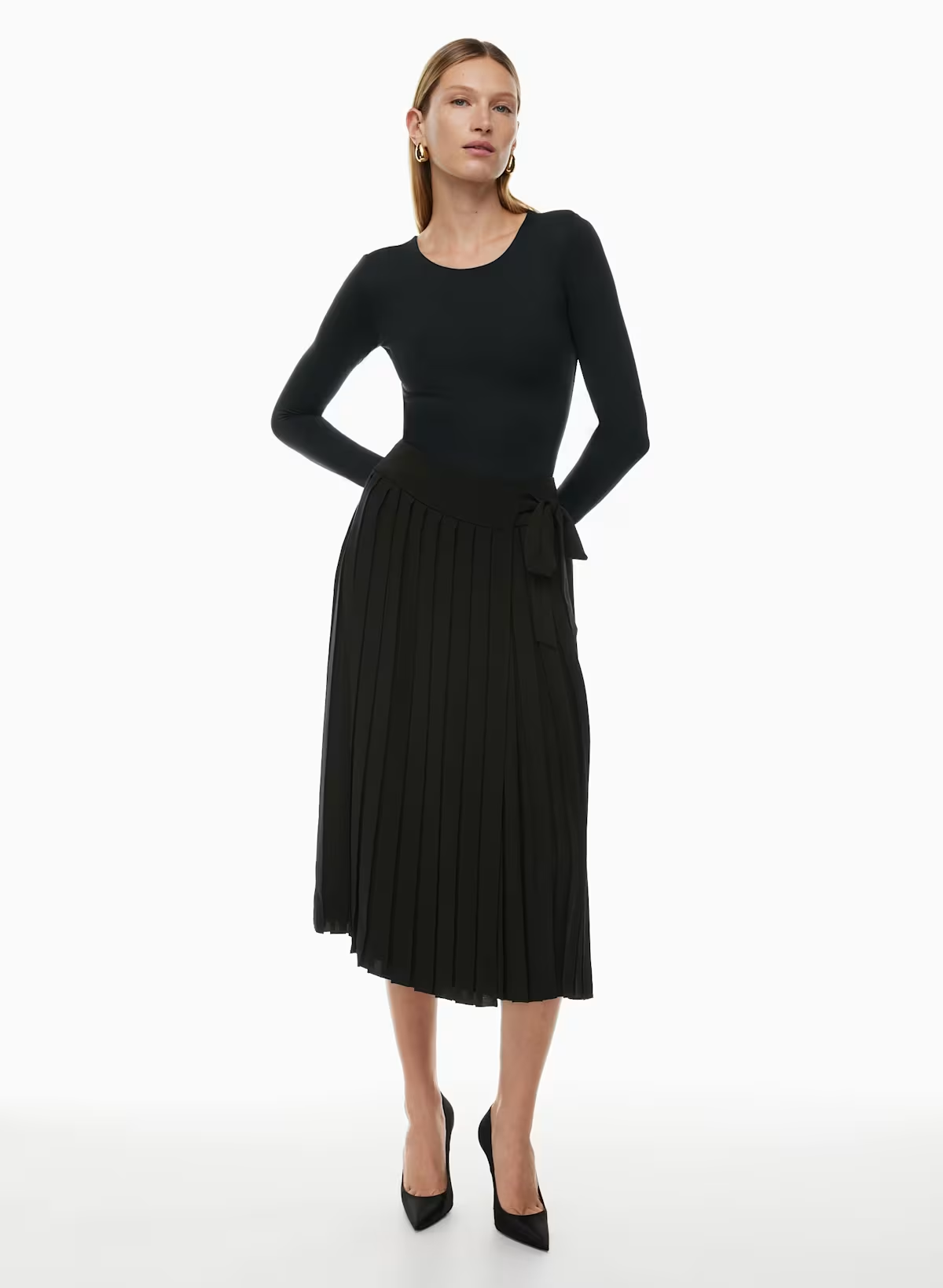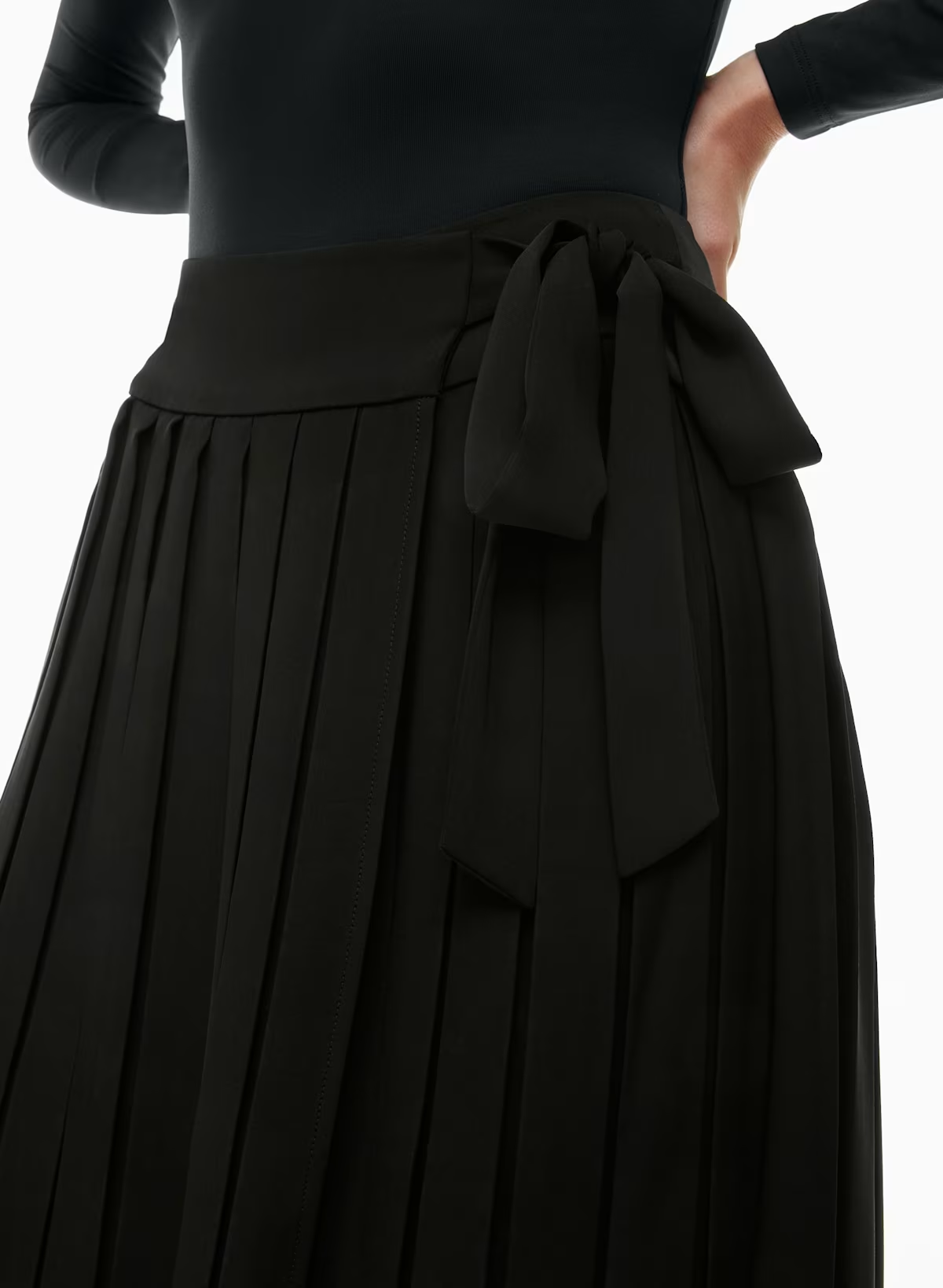 Details: This is a pleated midi wrap skirt with a high rise and a self-tie detail at the waistband. It’s made with Studio Drape — drapey matte satin with a smooth look and lightweight feel.