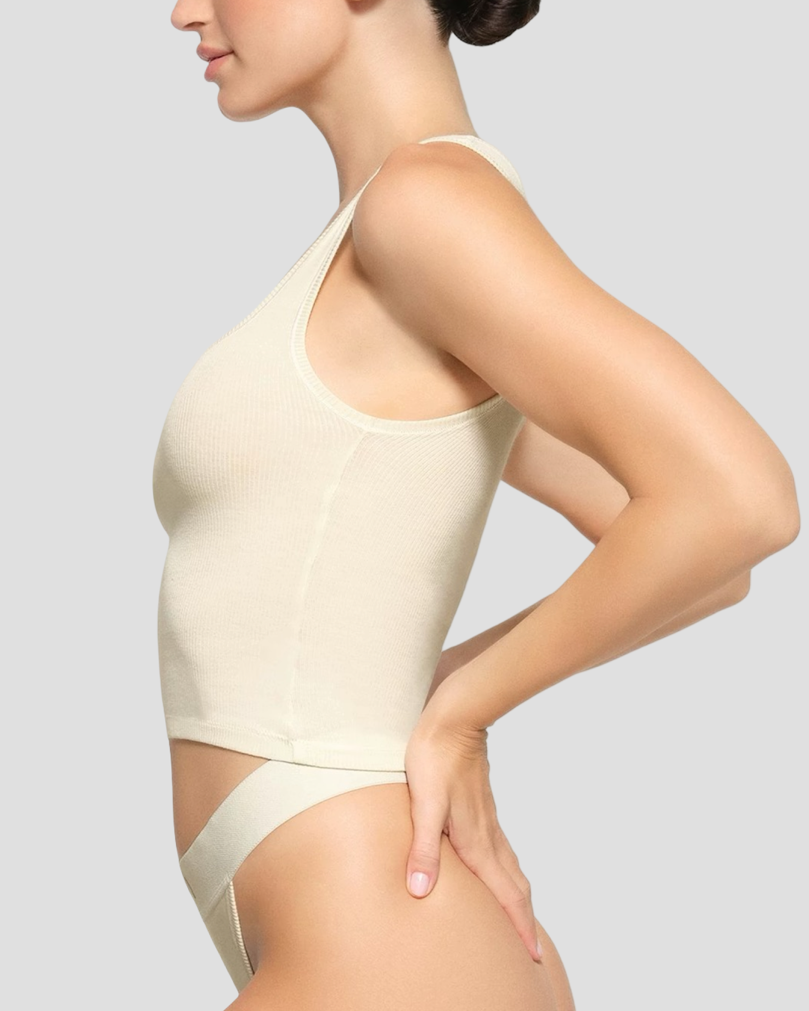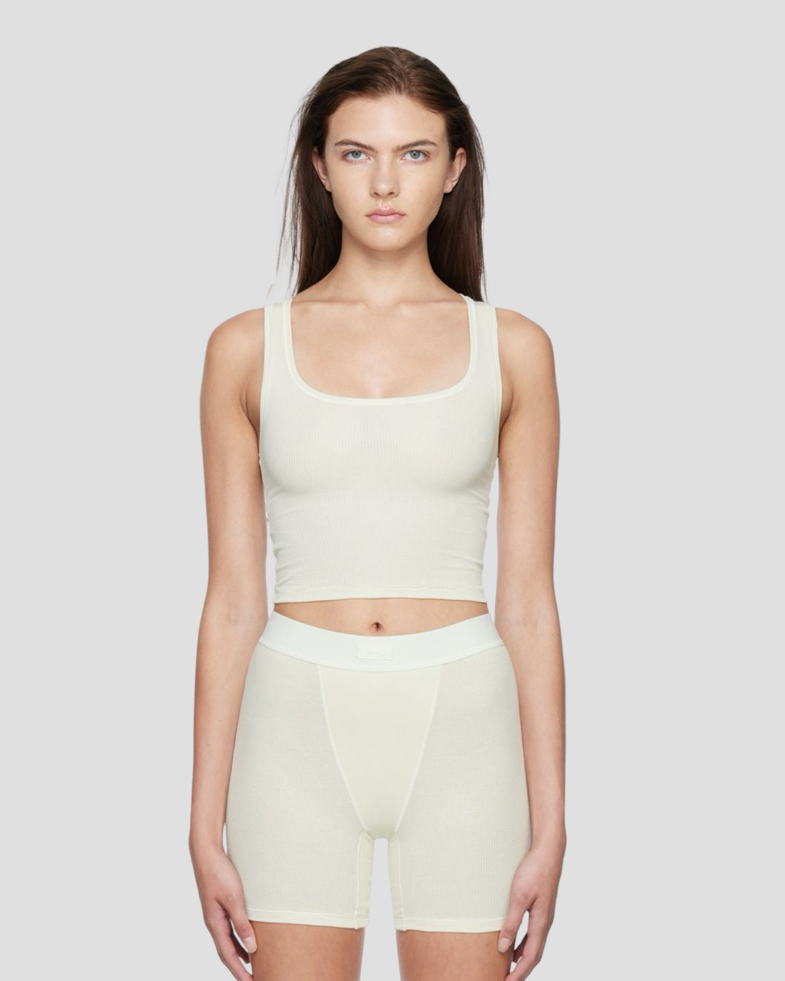Details: This classic style breathable ribbed Cotton that stretches to your curves for an all-day comfortable, flattering fit. The tank features a chic scoop neck and a slightly cropped length. The shorts exude a sporty look with boyfriend-inspired topstitching.
