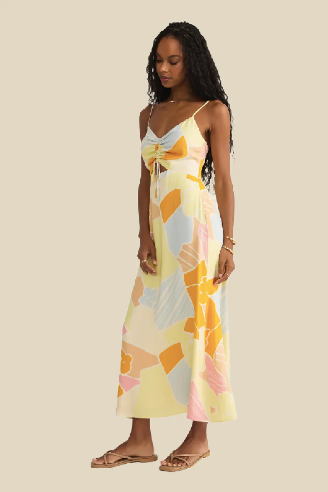 Details: Bright colours, a flattering cutout detail, and an airy linen fabric make this floral midi dress an instant favourite. The fitted bodice flows into a relaxed skirt, creating a silhouette that feels both playful and polished.
