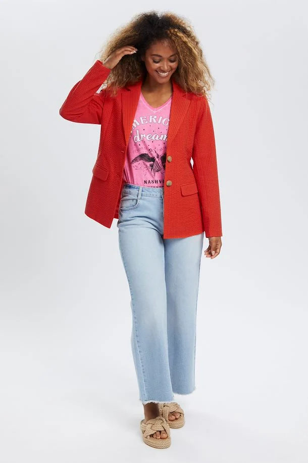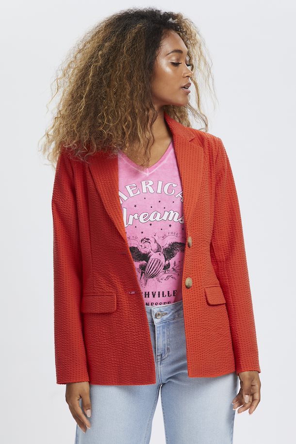Details: This is a hip-length seersucker blazer with a two-button closure. The fit is true to size.