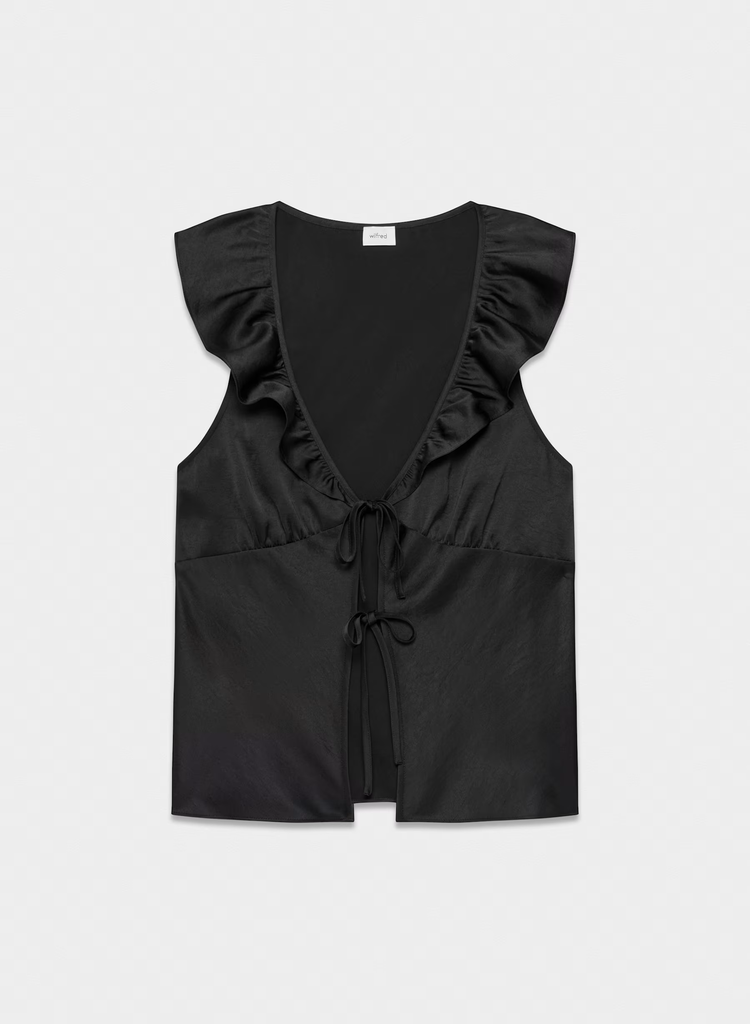 This is a sleeveless ruffled blouse with a V neckline and bias cut. It's made from Effortless Satin β drapey, lightweight Japanese satin with a glossy look and feel.