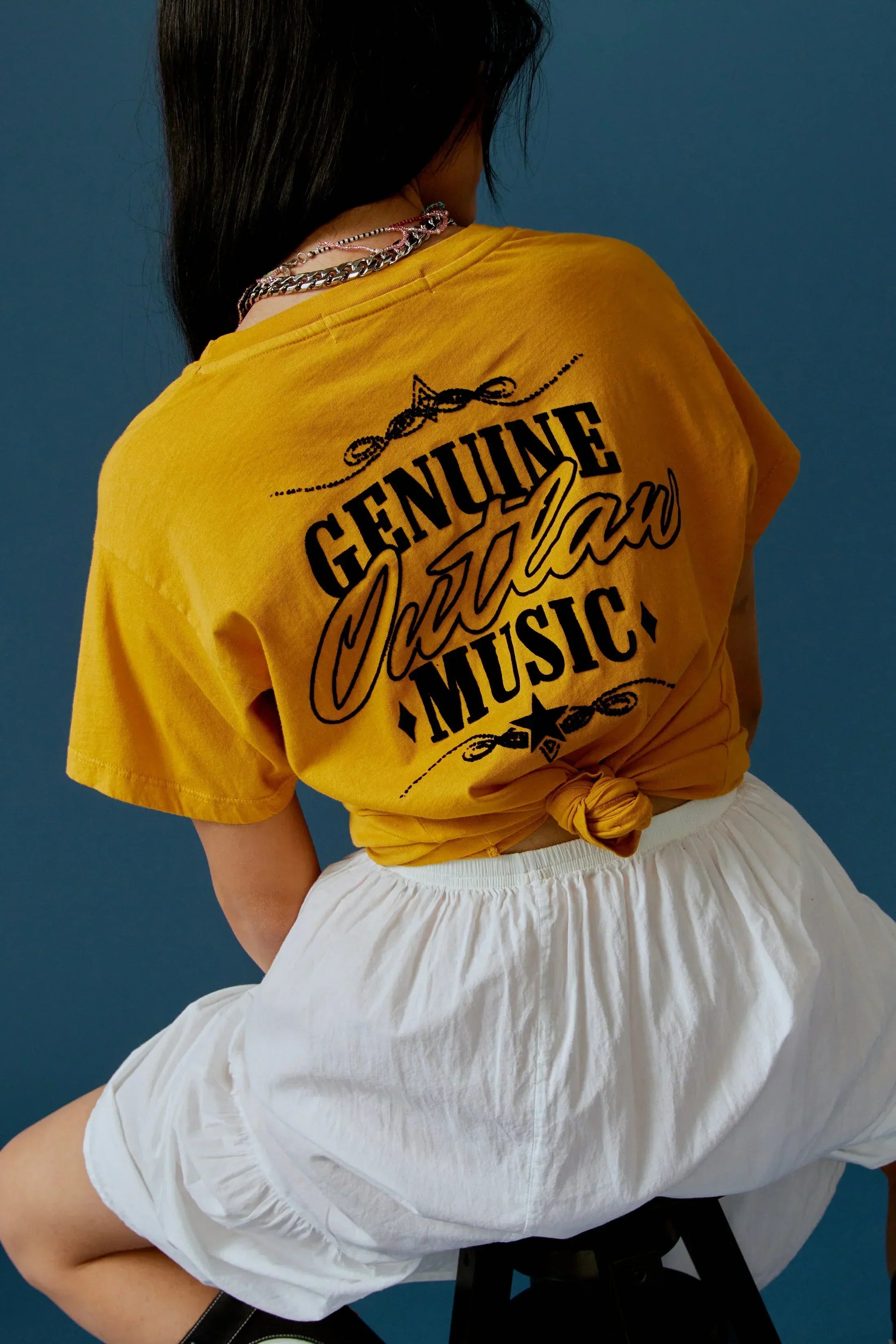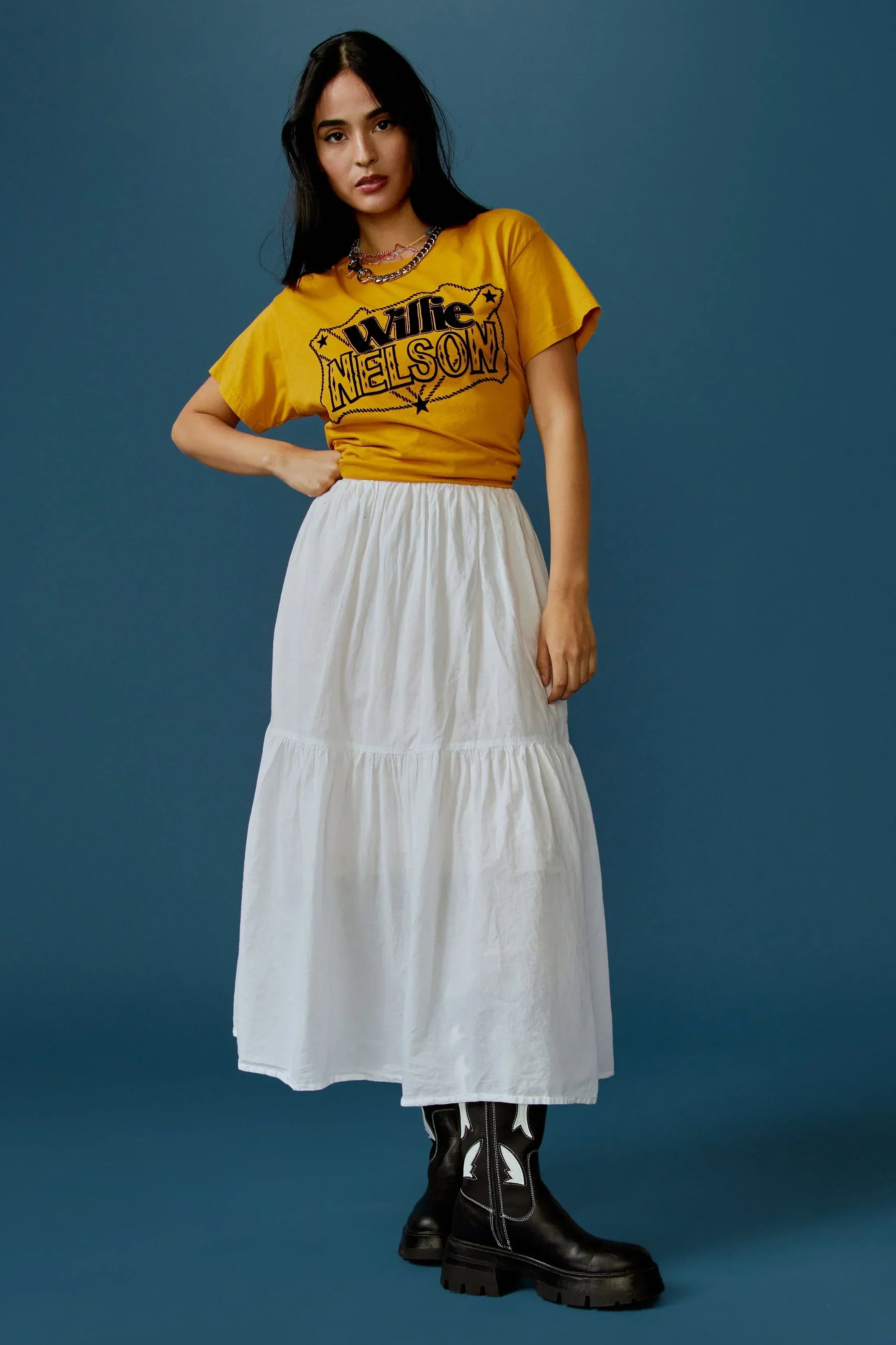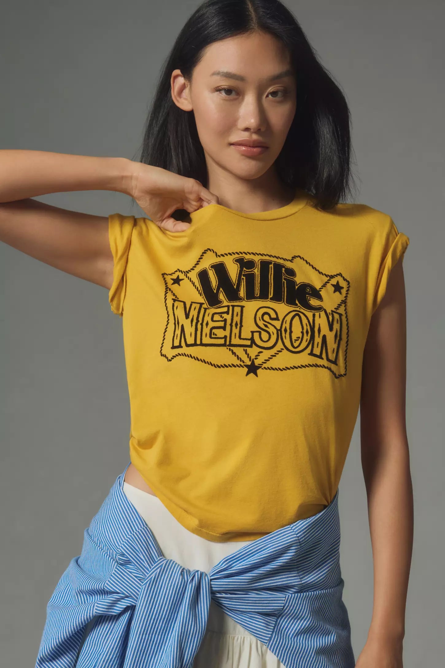 Details: This solo tee features "Willie Nelson" accompanied by true western motifs. Give it a tuck or a tie, thereβs no limit on the options around here. Accented in flocking front and back.