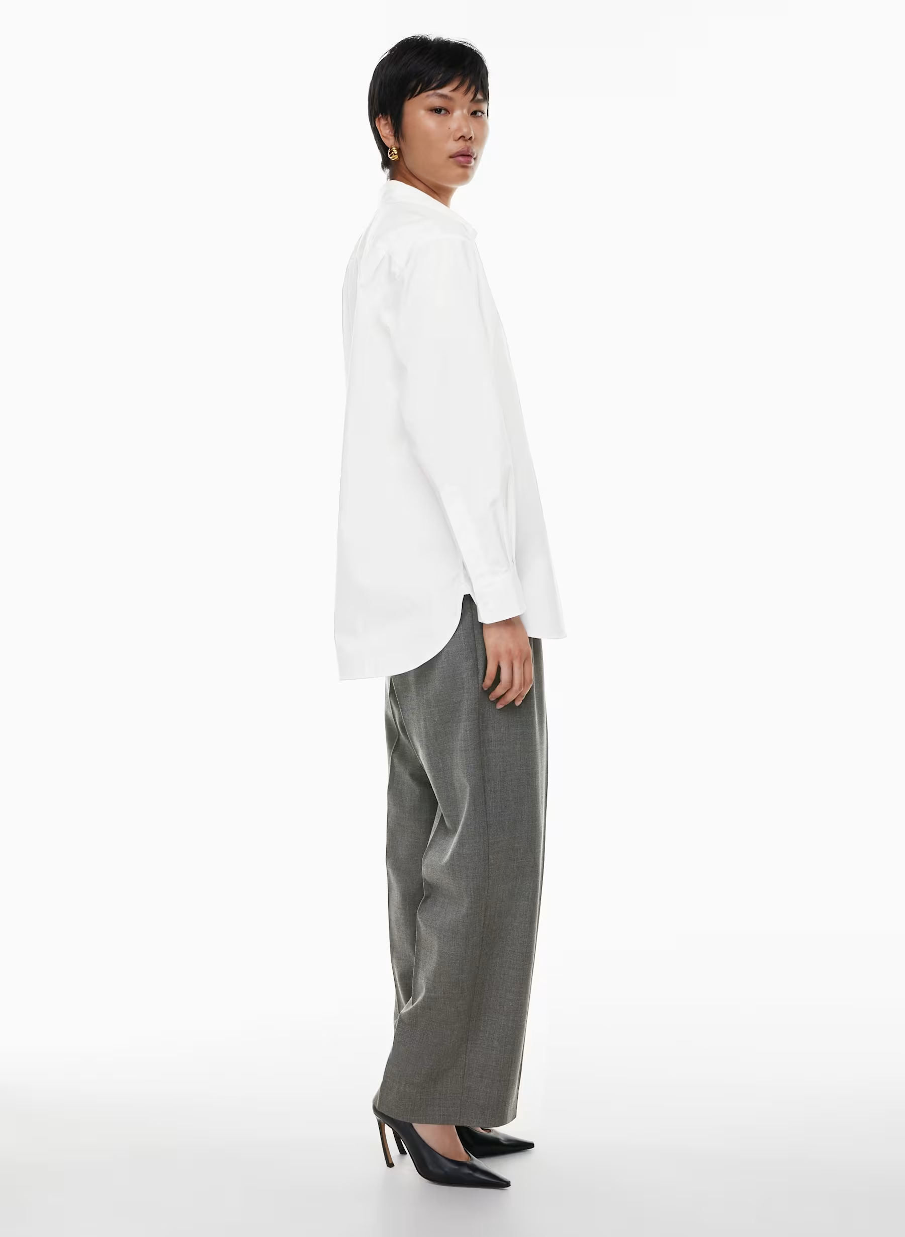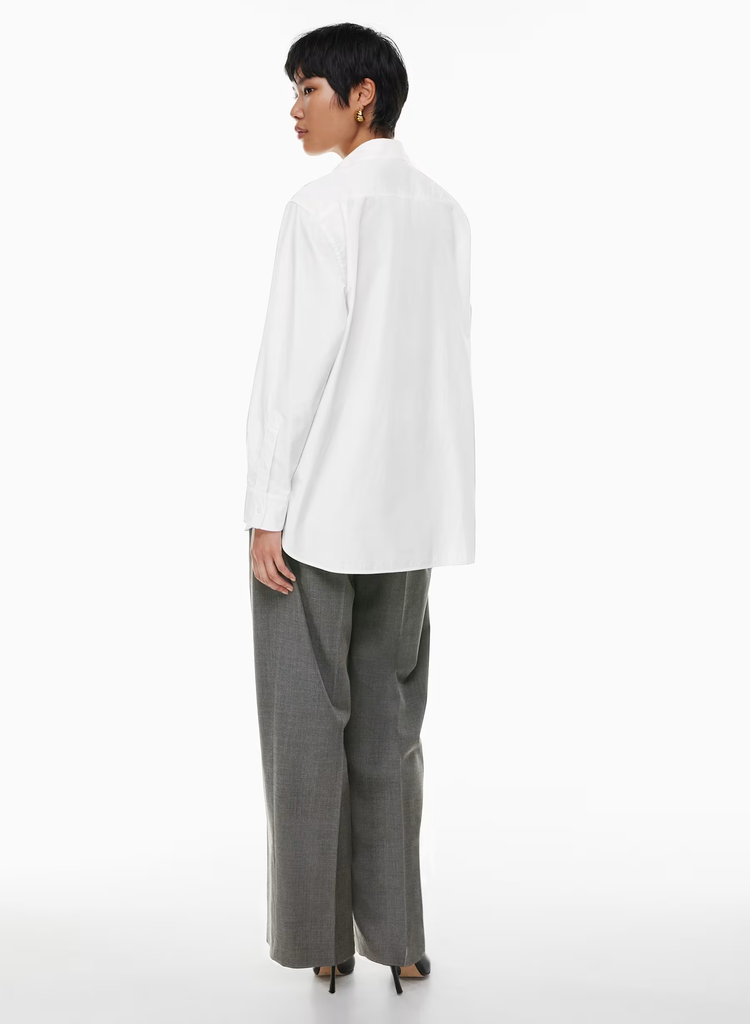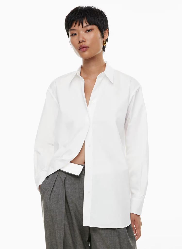 This is an oversized-fit button-up shirt with dropped shoulders.