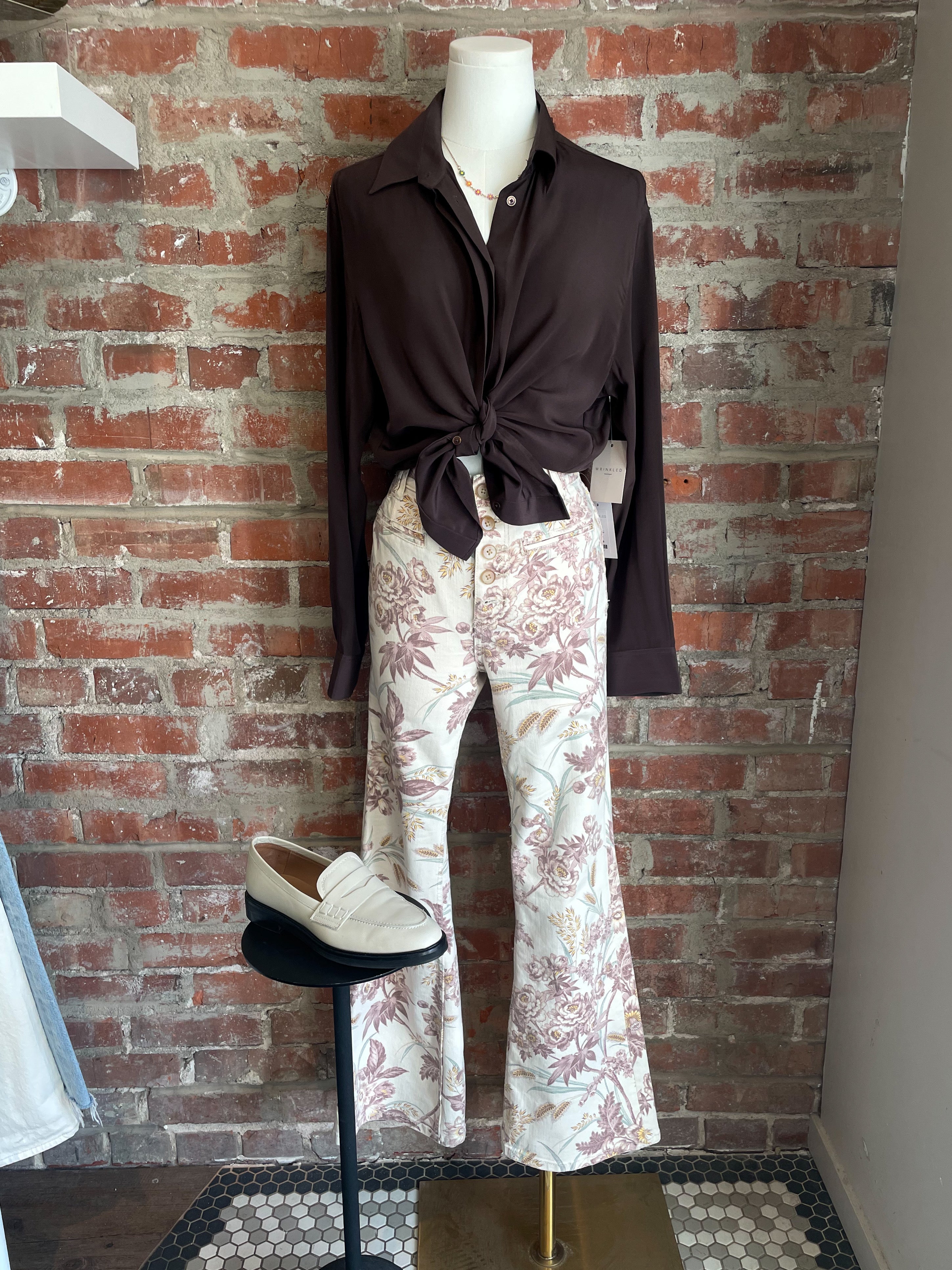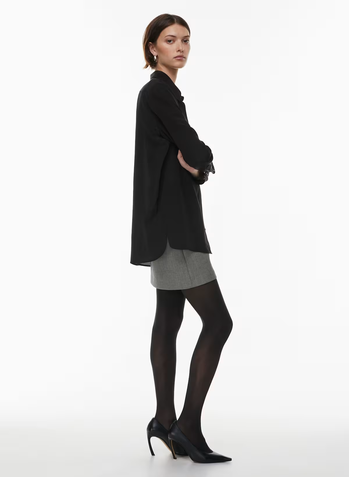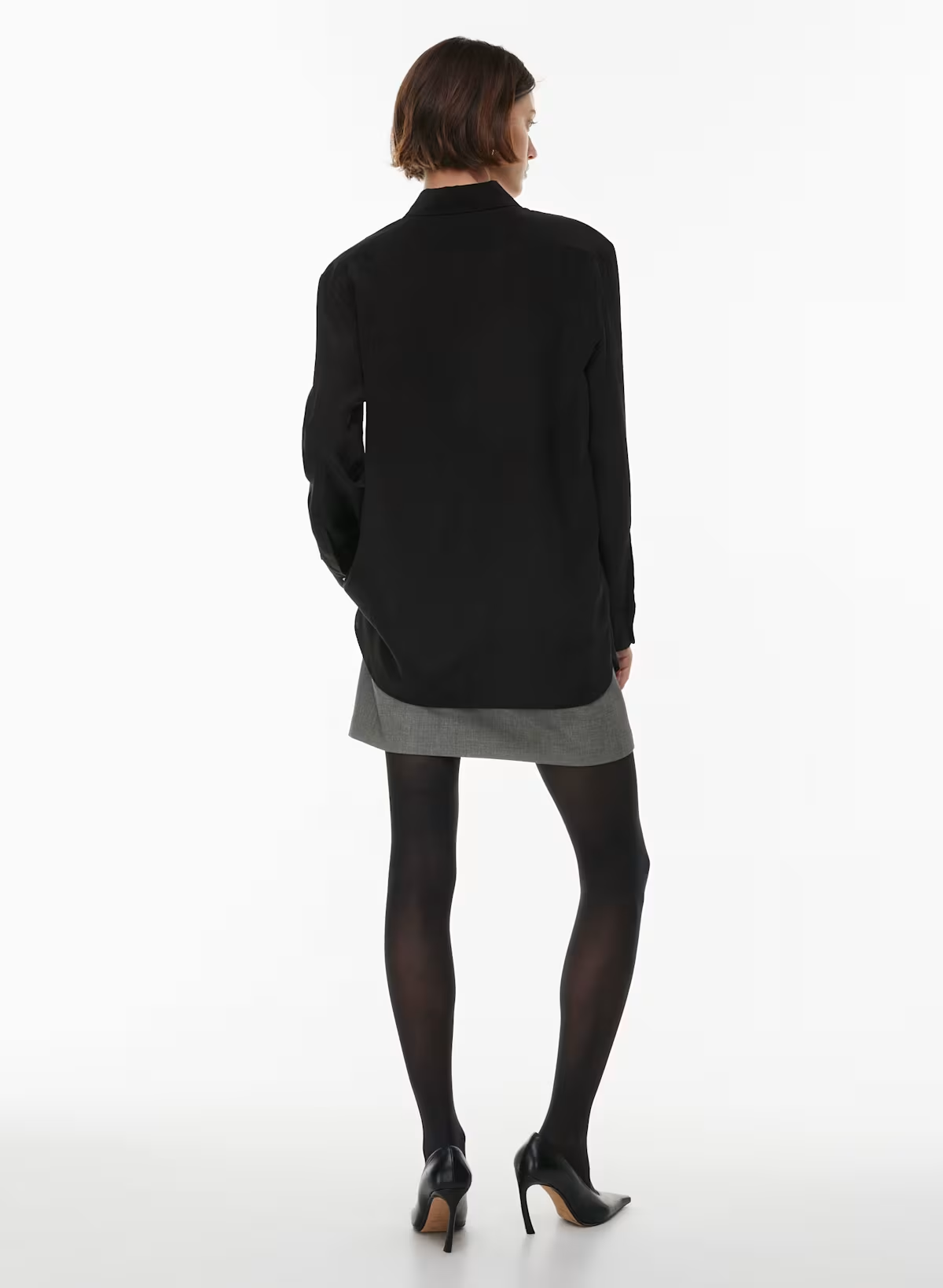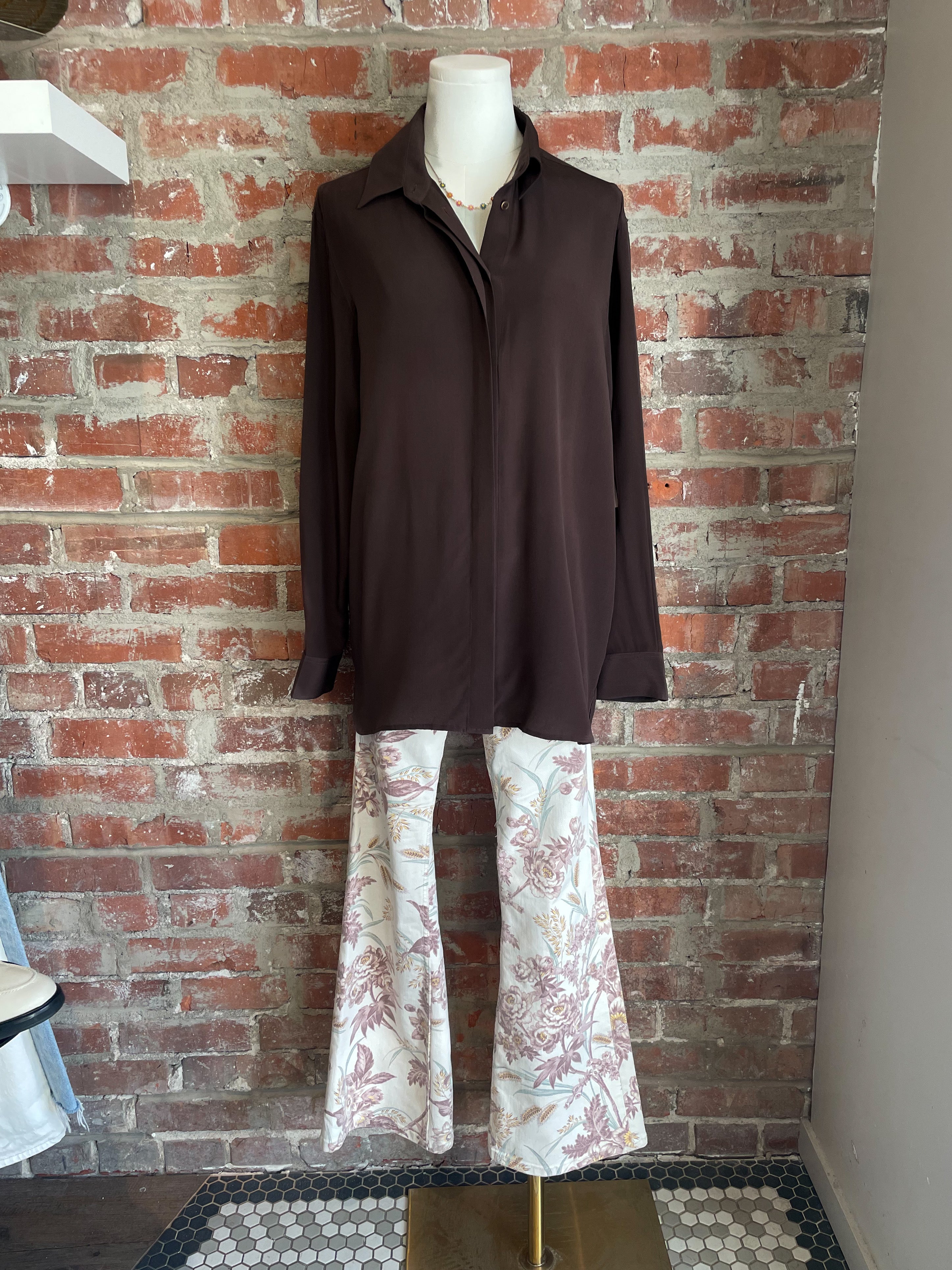This is a collared button-up blouse with long sleeves, dropped shoulders and a relaxed fit. It’s made from lightweight 100% silk with a subtle texture.