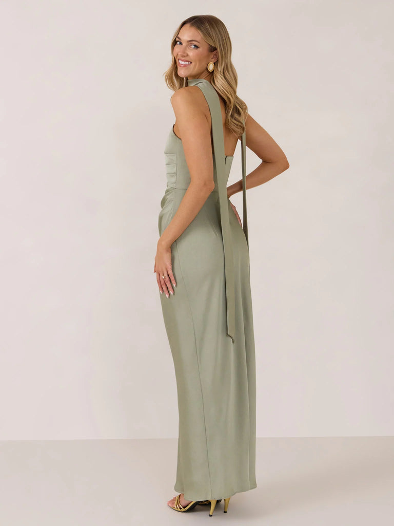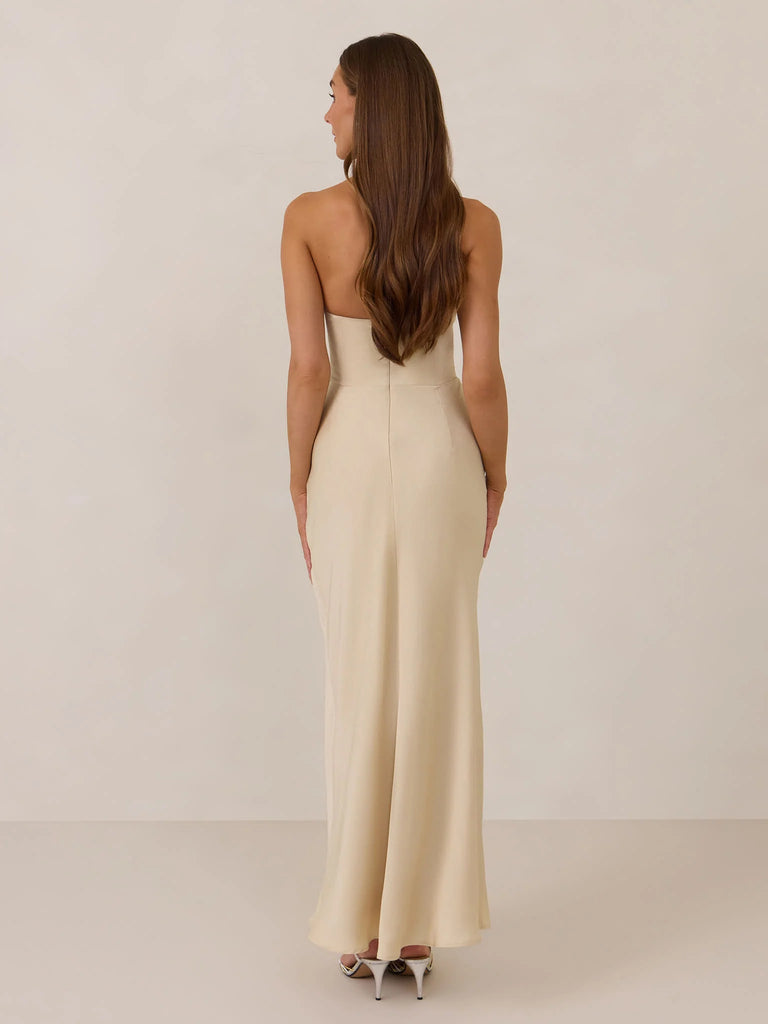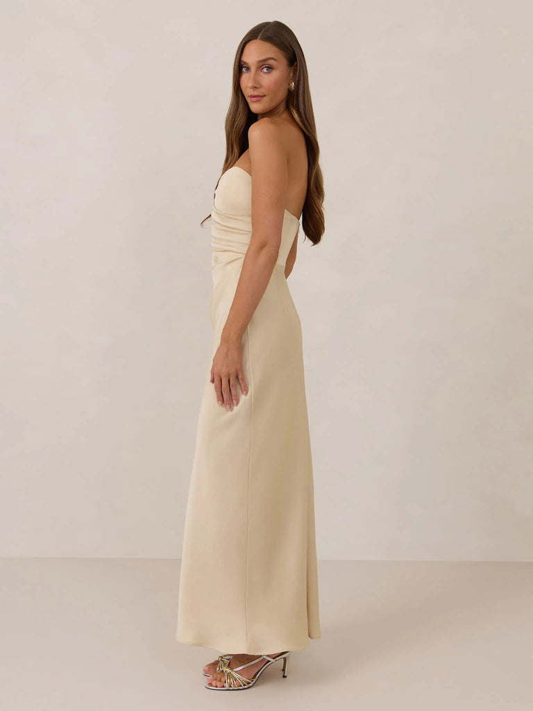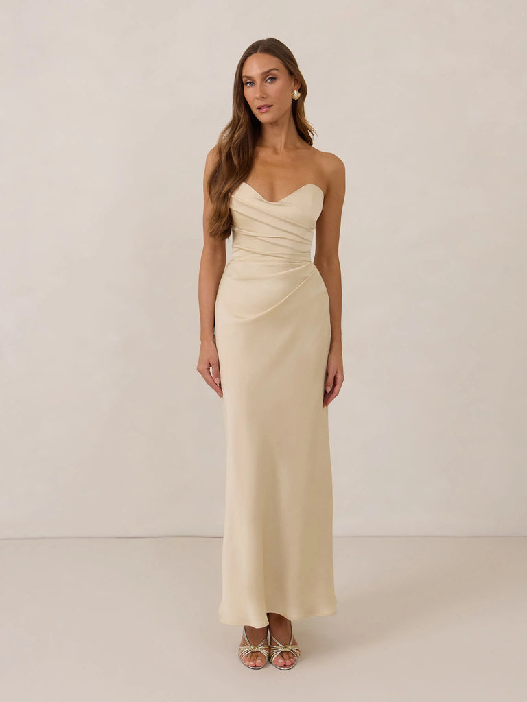 Details: Designed with a scoop sweetheart neckline and soft pleating through the boned bodice and skirt, this dress creates a sleek, feminine silhouette. Elegant and timeless, itโs an ideal choice for weddings, receptions, or any formal occasion.