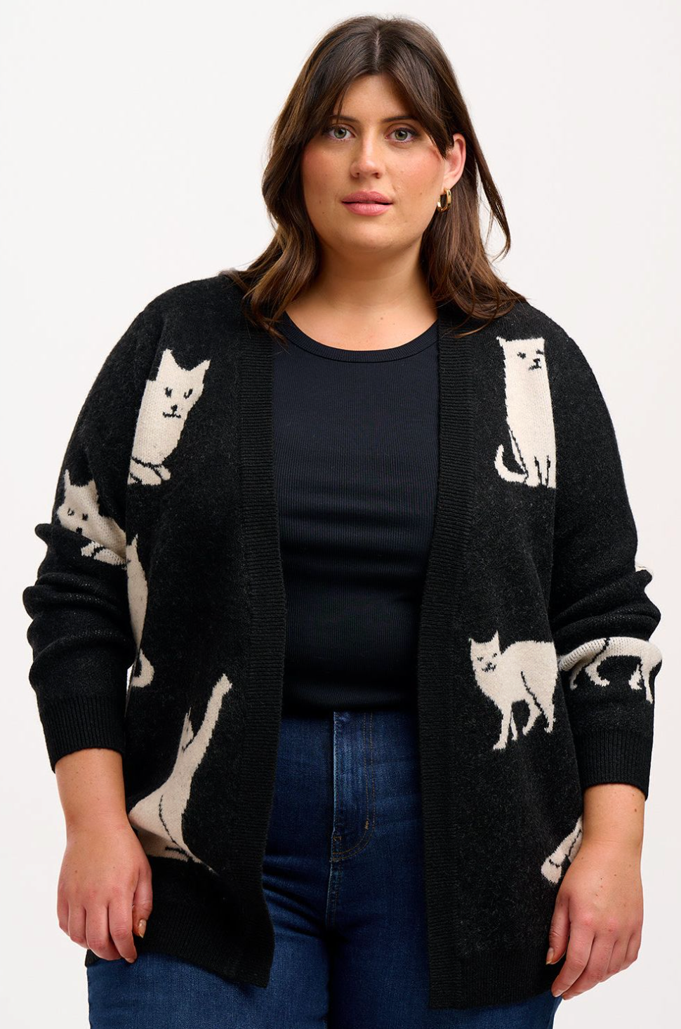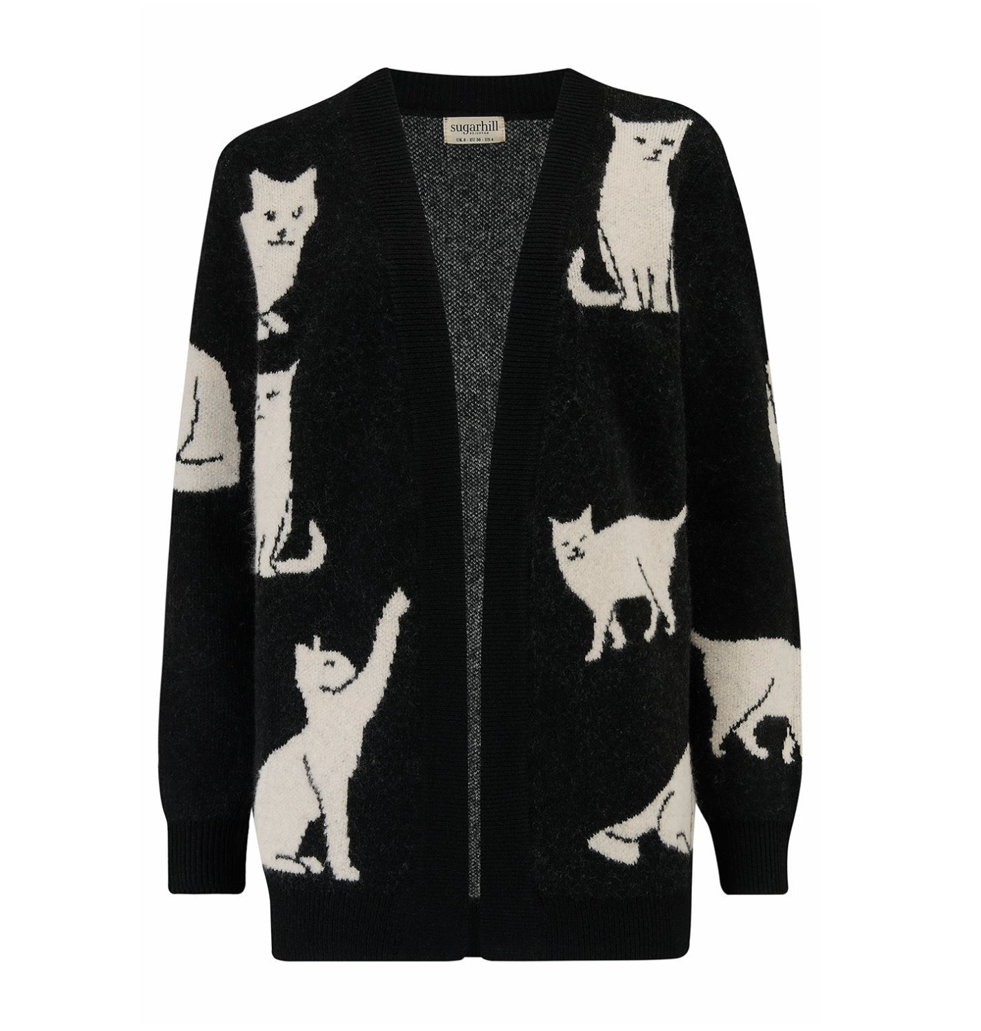 Details: The open fronted, loose fit Laura cardigan has a thick, cosy, edge-to-edge knit. This design features large white cats on a black base.