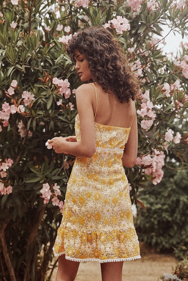 Details: Sequins for every season. Fitted floral sequin spaghetti strap mini dress with kicky ruffle. Trim details at empire waist and ruffle hem.