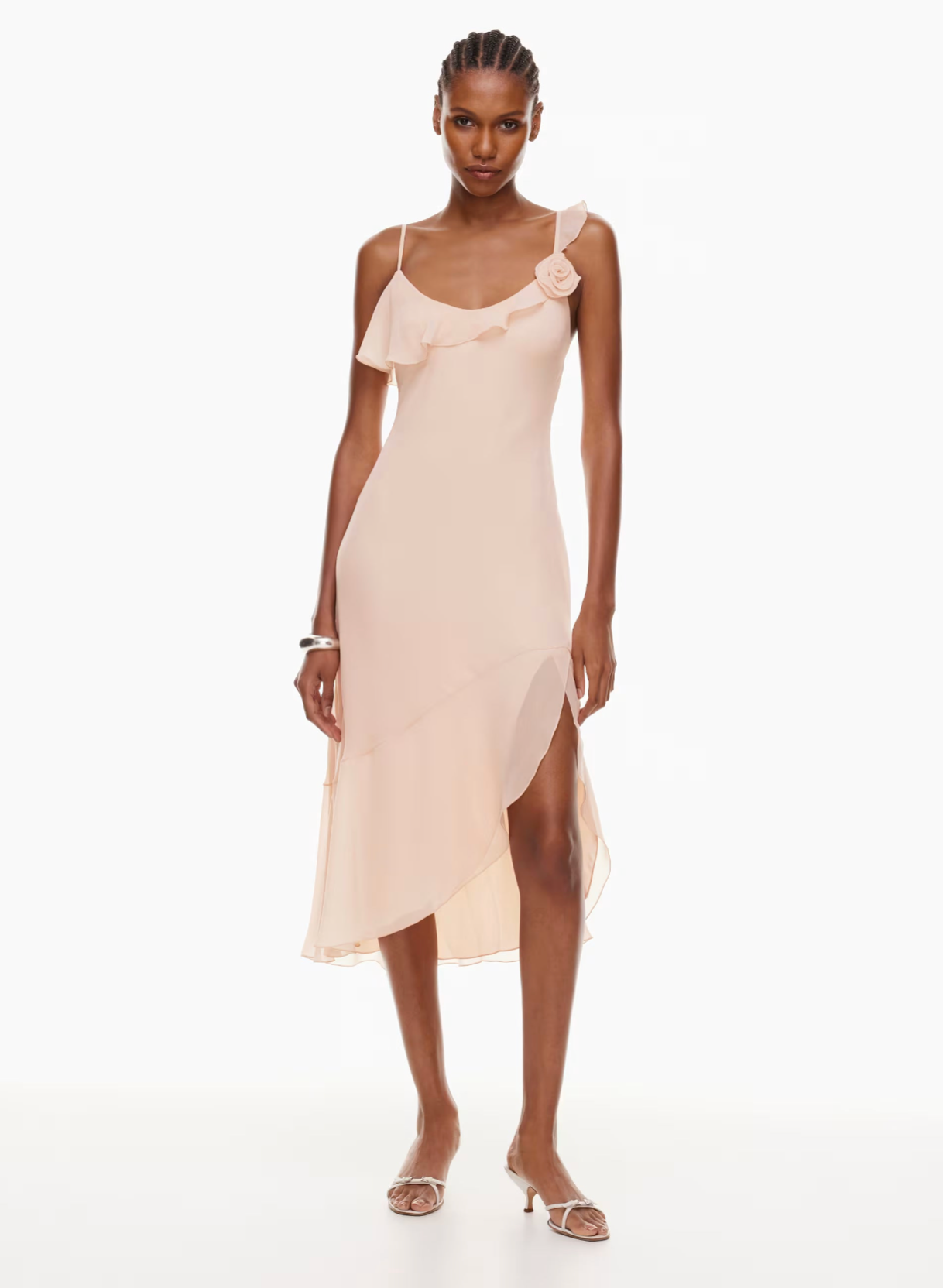 Details: This is a ruffled fit-and-flare dress with adjustable straps and a rosette detail. It is lightweight and made with a semi-sheer fabric with an ethereal drape.