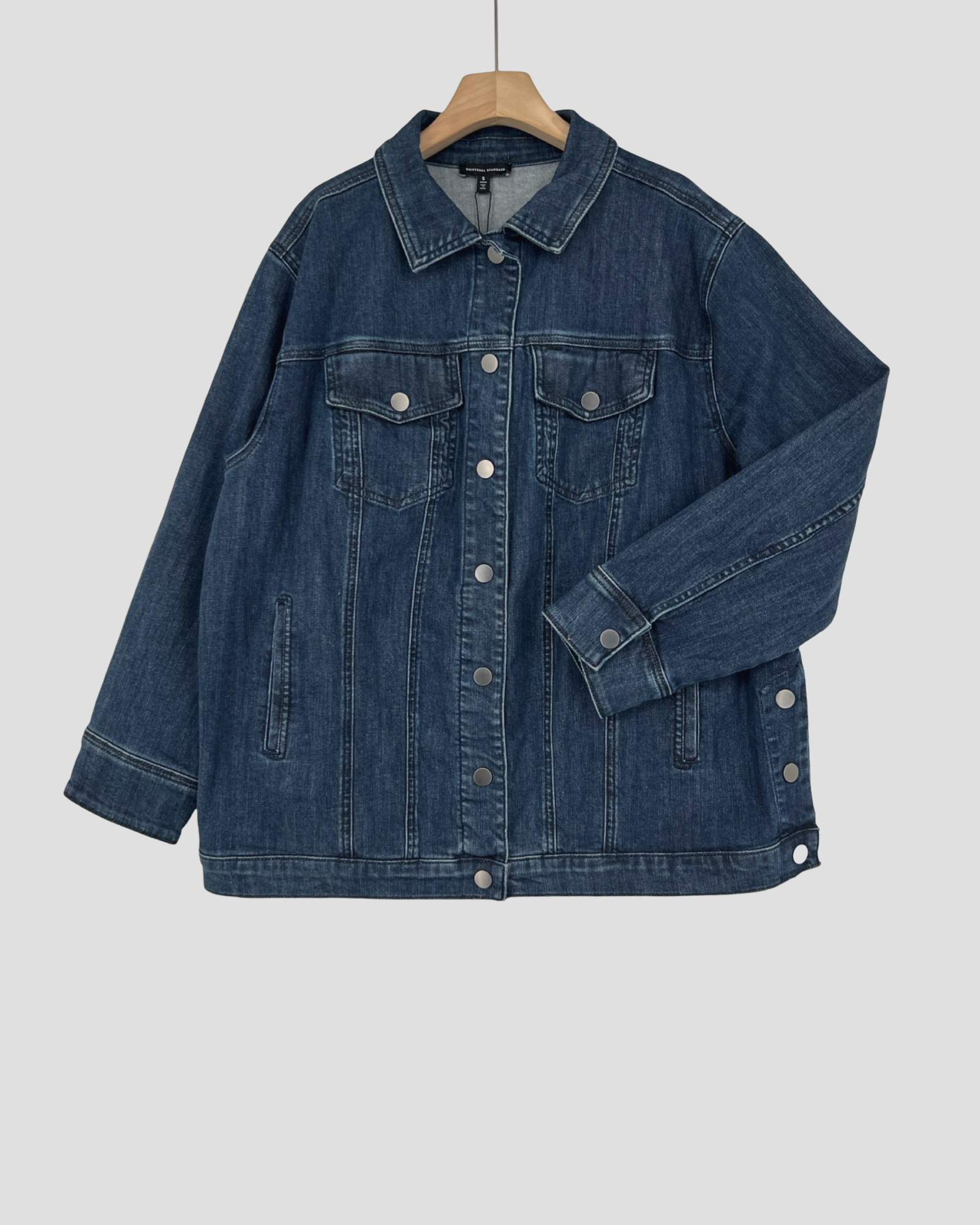 Details: An ultra-cool longline denim jacket made from our signature stretch denim is here. Meet the Denim Chore Jacket. With a longer length that goes past the hips, and snaps on the side that allow you to open or close depending on your preference, this jacket is very versatile. The Denim Chore Jacket has plenty of pockets - at the chest and hips - so you can go hands free. Utilitarian ease and modern style come together in this jacket. Perfect to layer with now and later.