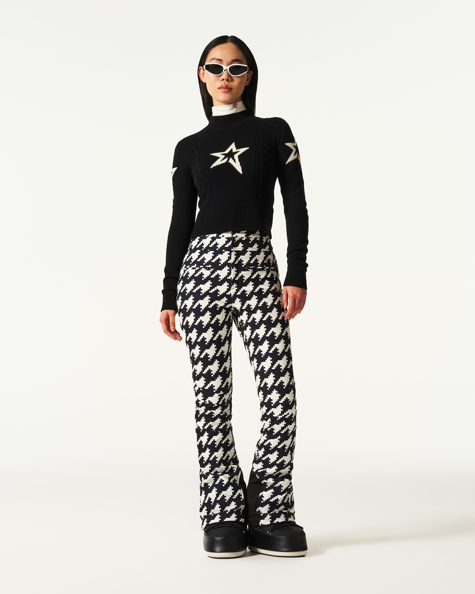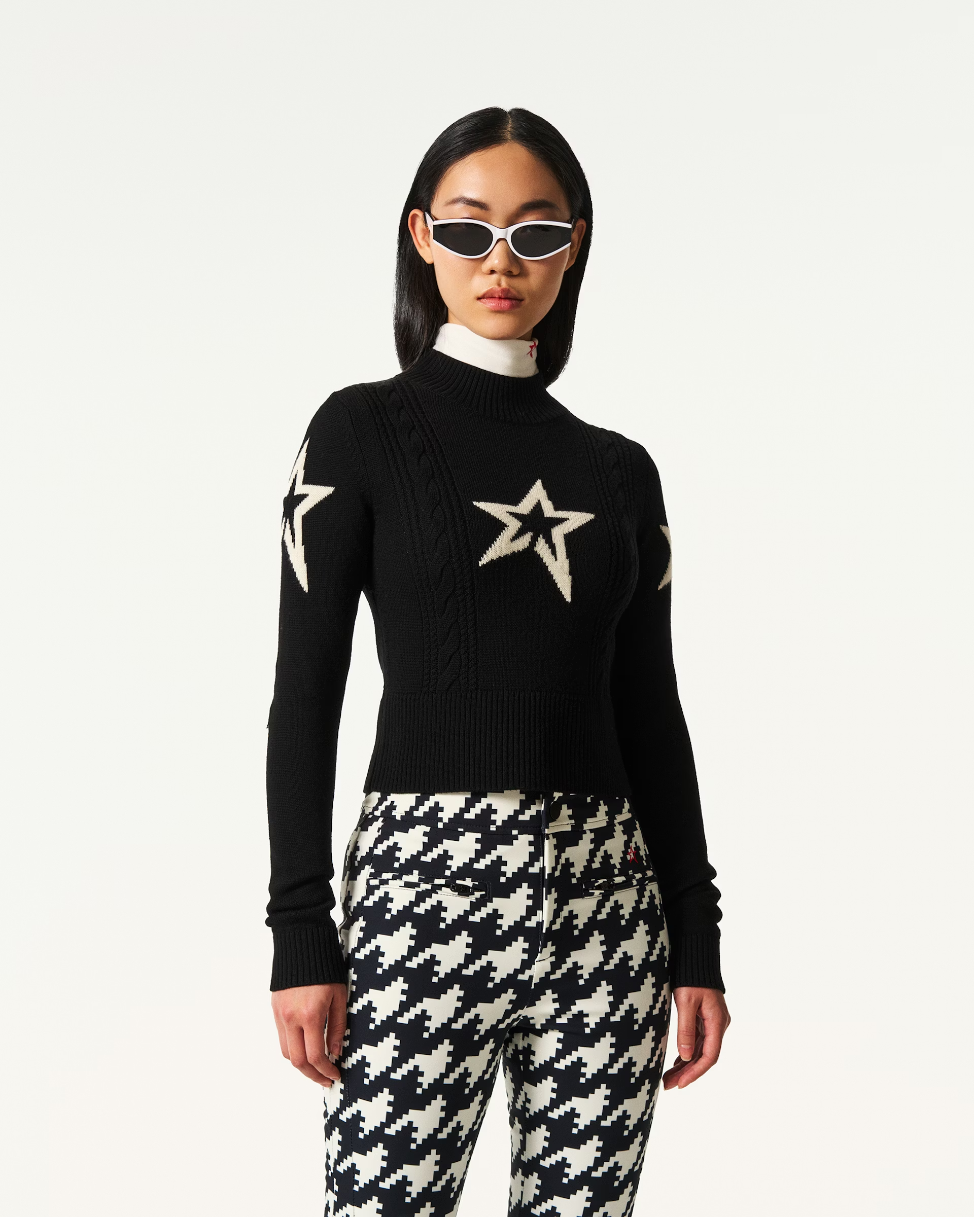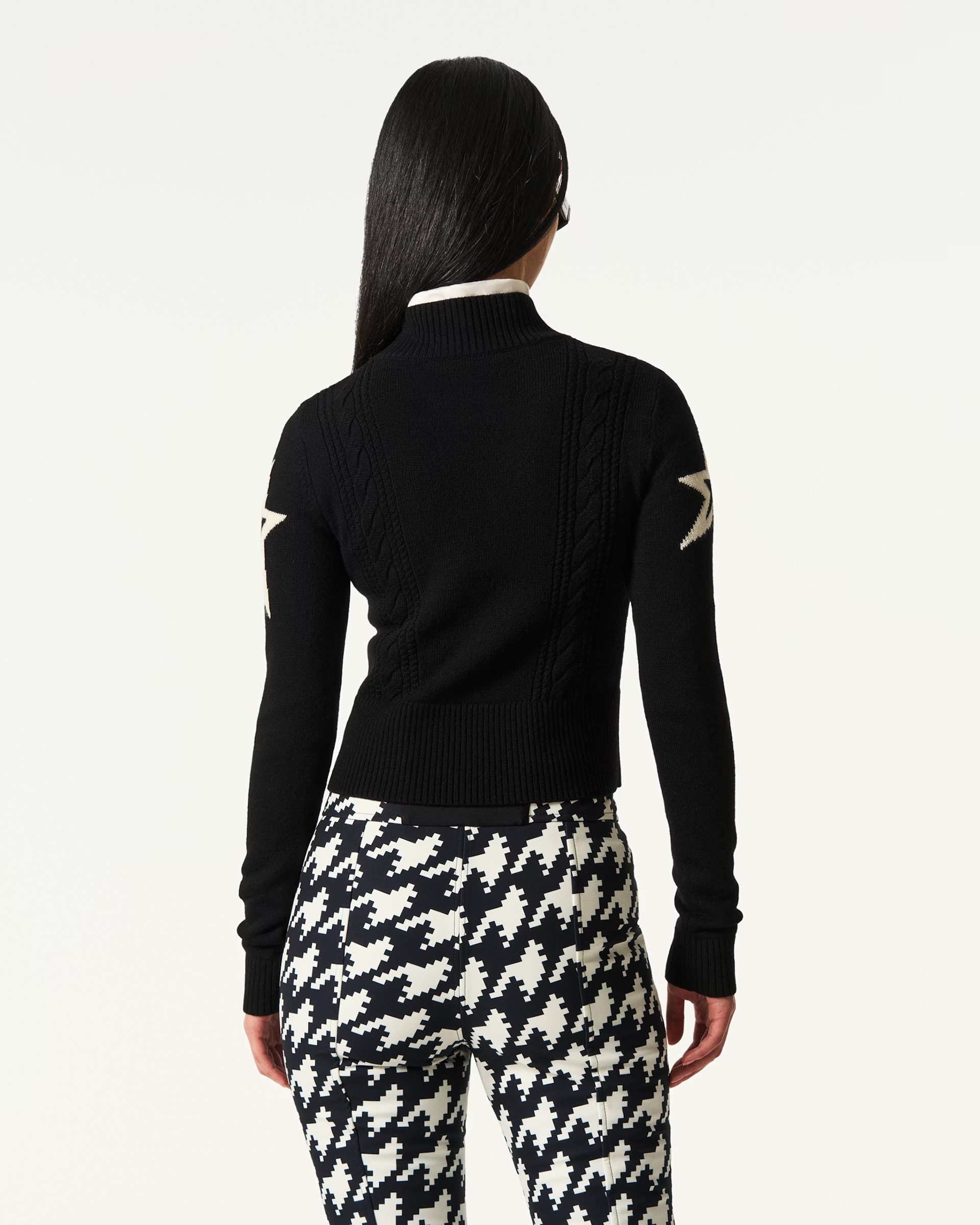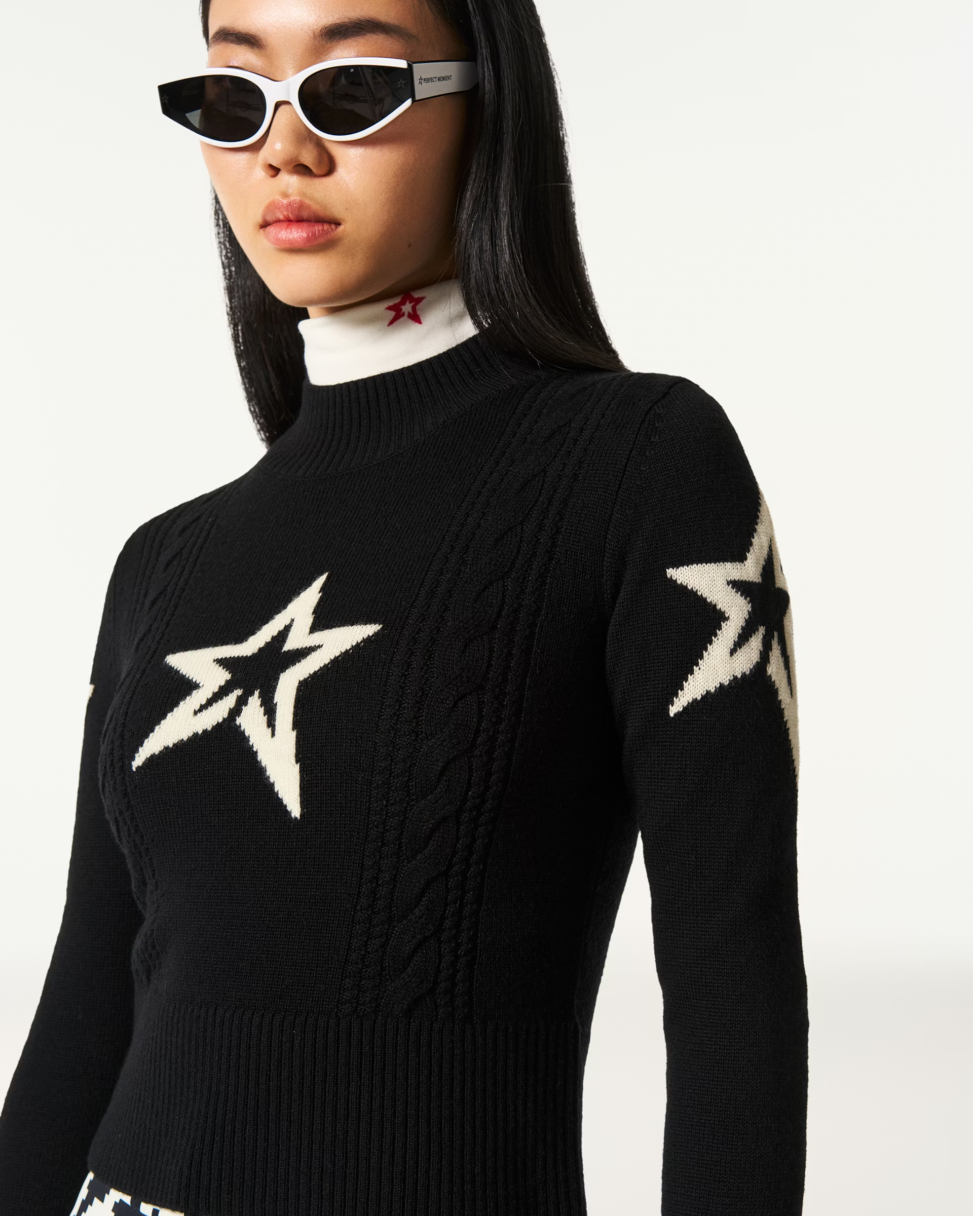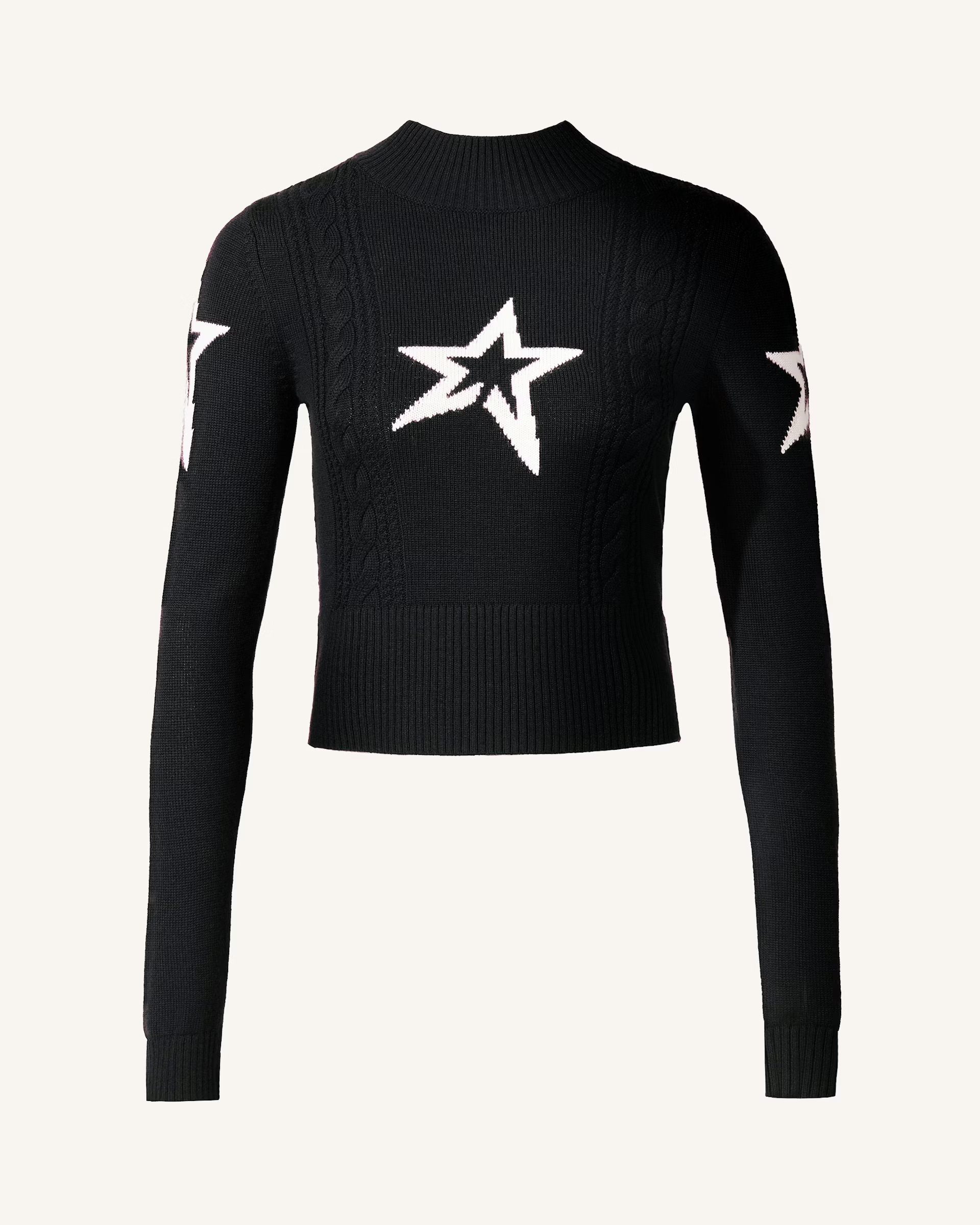 Details: Streamlined and chic, the Cable Knit Sweater features a cropped fit with a bold star intarsia and directional cable-knit detailing down the front. Crafted from soft fine-gauge knit with a mock neck and ribbed trims, it delivers warmth and clean-lined style in one sleek layer. Style with high-waisted ski pants or layer under salopettes for a polished alpine look.