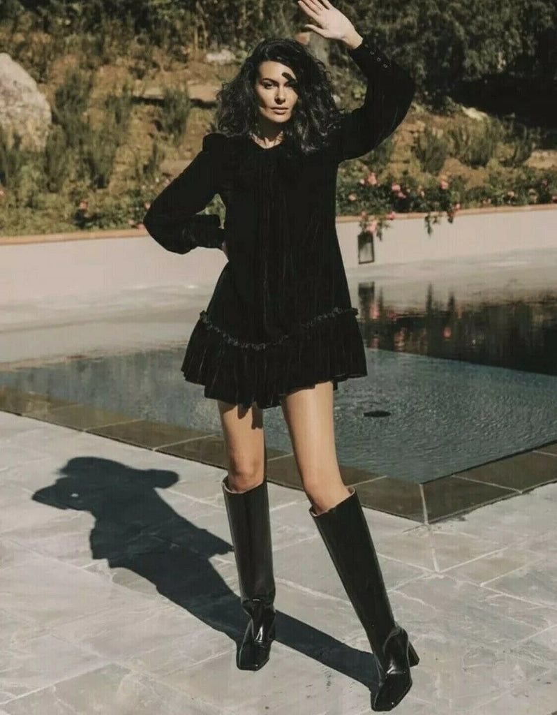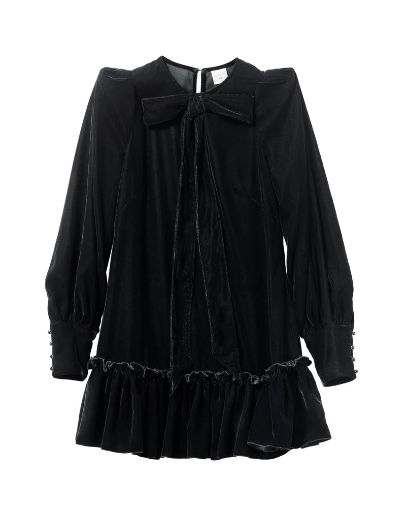 Details: The Mini Mystery Dress is a short, A-line dress in velvet made from recycled polyester. The dress has a round neckline and large, attached bow with long ties at the front and an opening at the back with a button at the back of the neck. Long puff sleeves with organza padding at the top for defined shoulders and added volume, and close-fitting, double-layered cuffs with stylish, detailed buttons. Seam with a wide overlocked frill trim at the hem. Unlined.