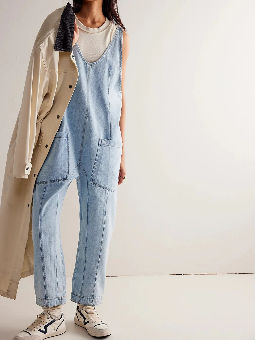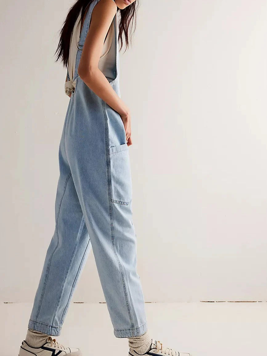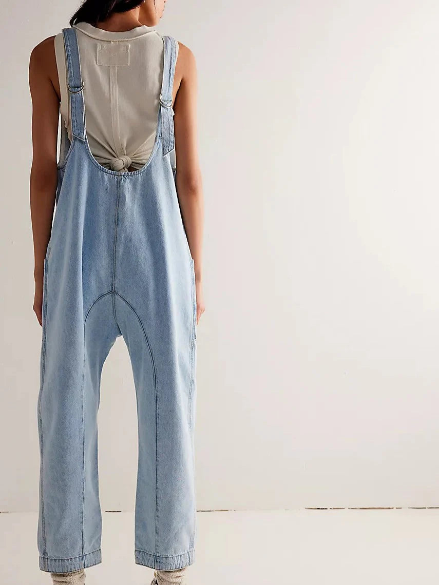 Details: One-and-done and so simple, this denim jumpsuit from Free People is featured in a relaxed fit and cropped ankle-length style with harem legs and a low scoop neckline.