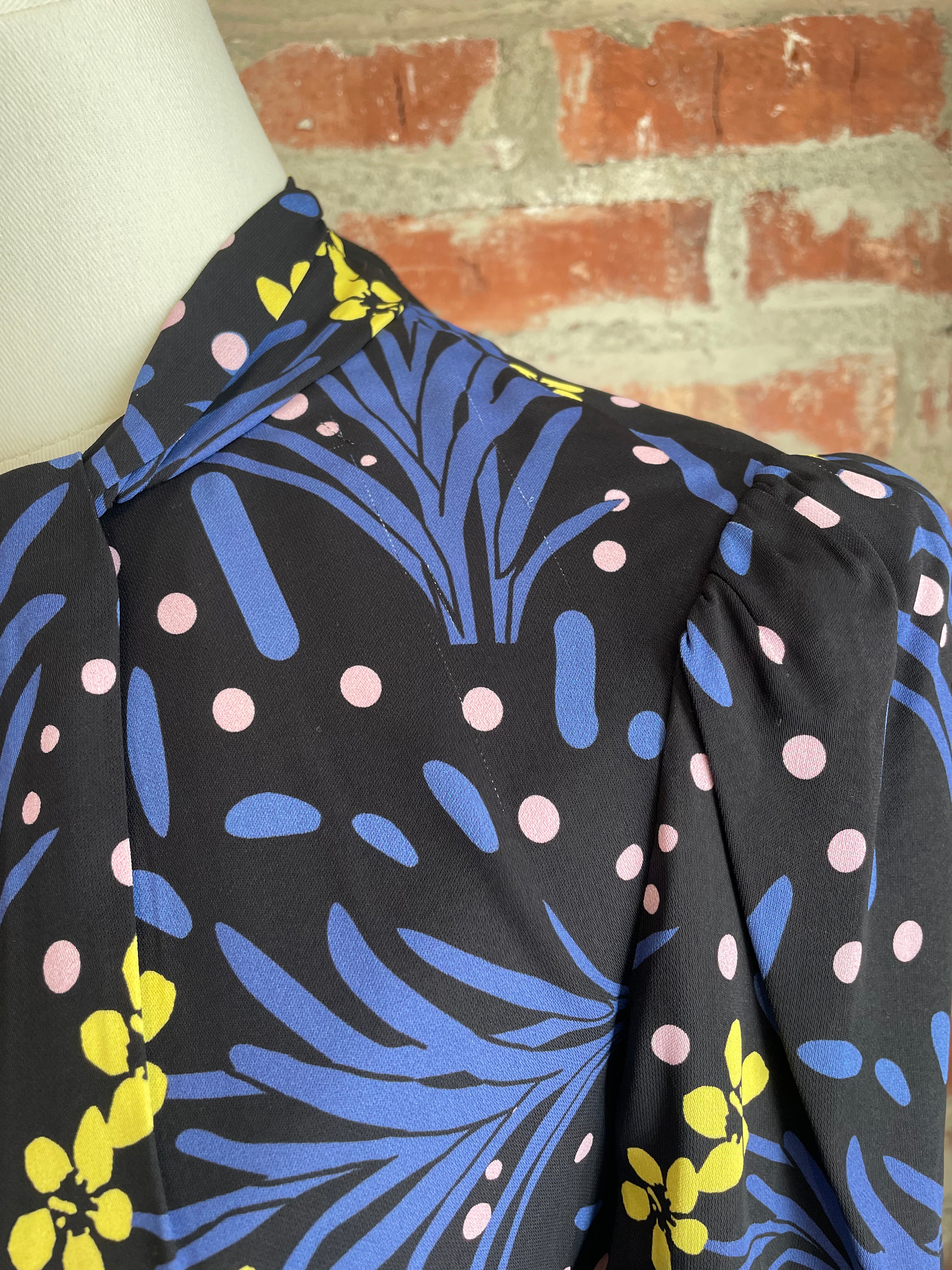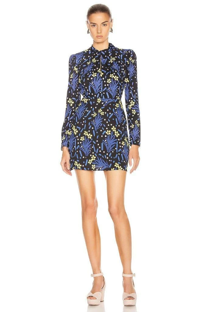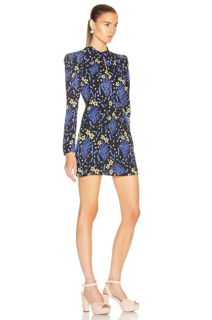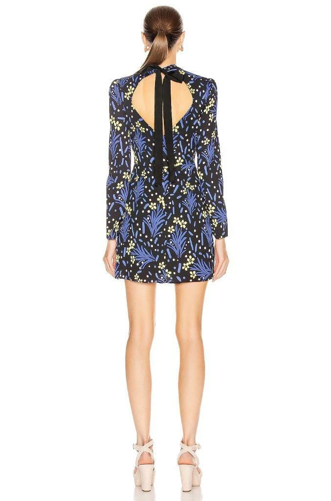 Details: Long-sleeve mini dress featuring a bold blue and black print with a sleek, tailored fit. Designed with a high neckline and an open back detail with tie closure for a striking finish. Perfect for nights out or statement occasions.