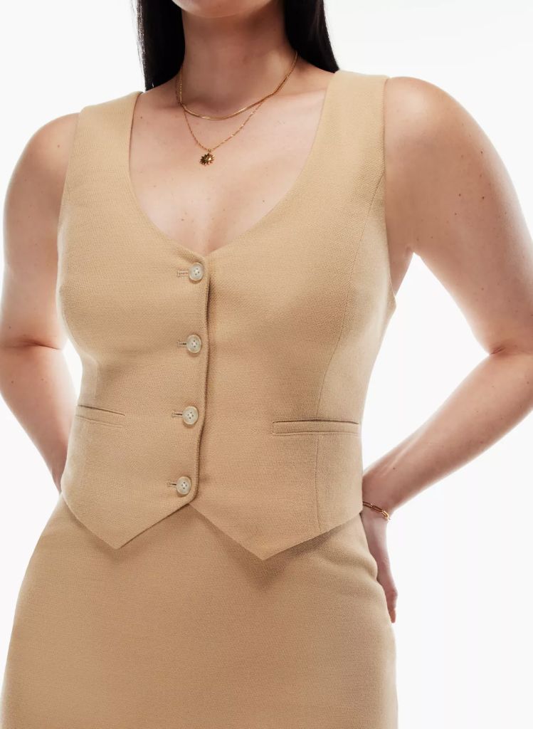 Details: This is a V-neck vest with welt hand pockets and princess seams for shaping. It’s made from comfortable, stretchy suiting fabric. Fully lined.