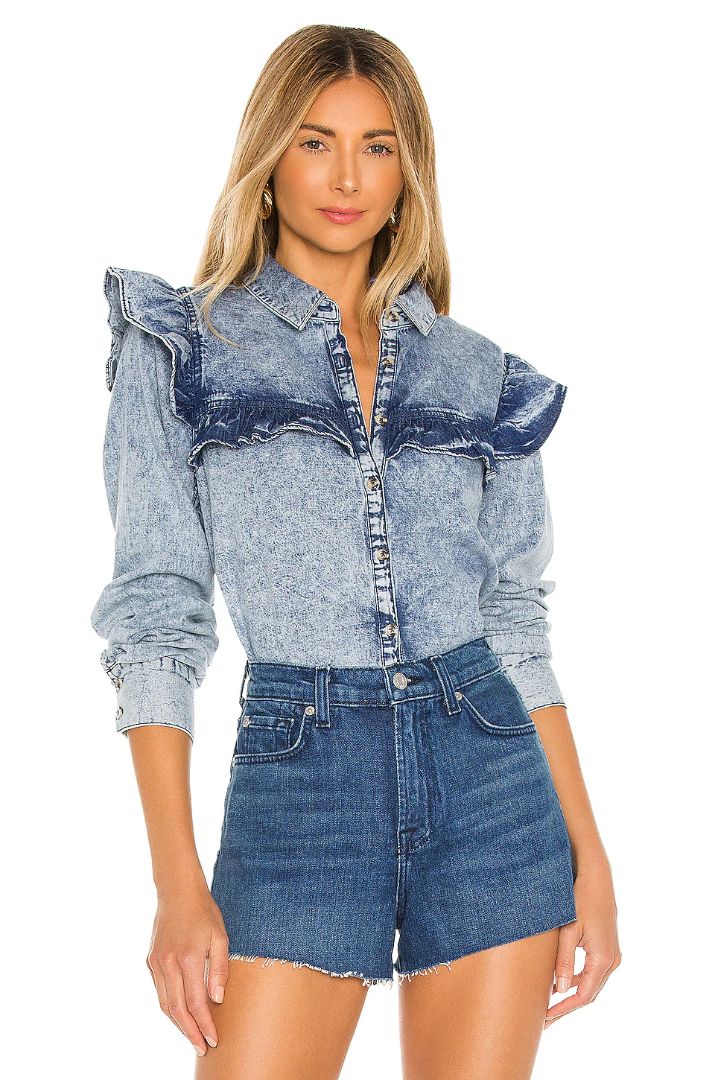 Details: Front button closure. Ruffled trim. Buttoned cuffs.