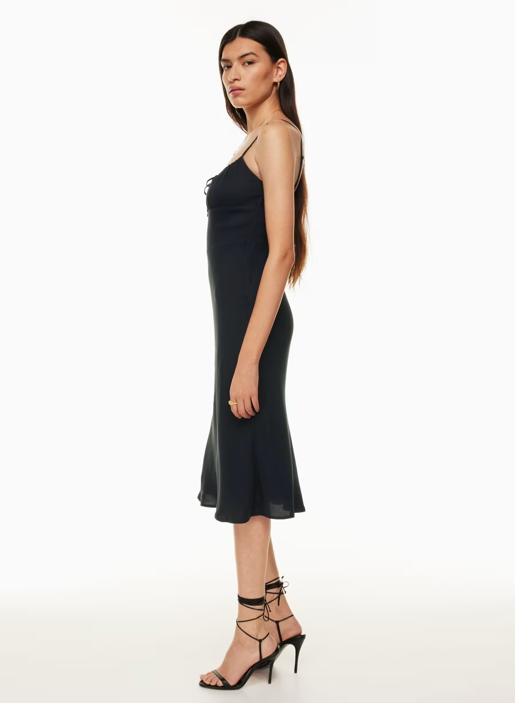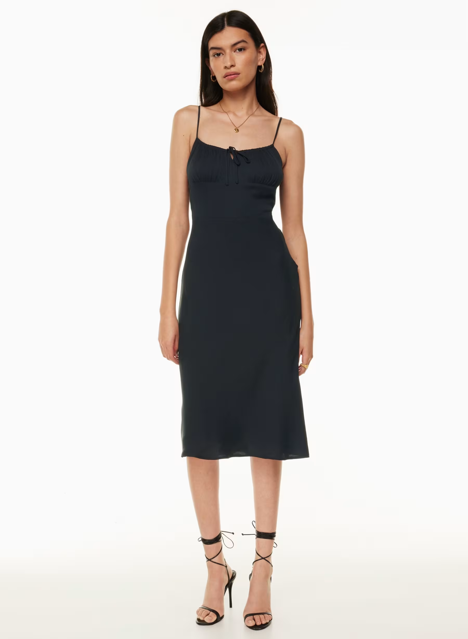 Details: This is a slip-style midi dress with a ruched bodice, smocked back and a tie detail. It’s cut from ReCrepe, lightweight, drapey crepe fabric.