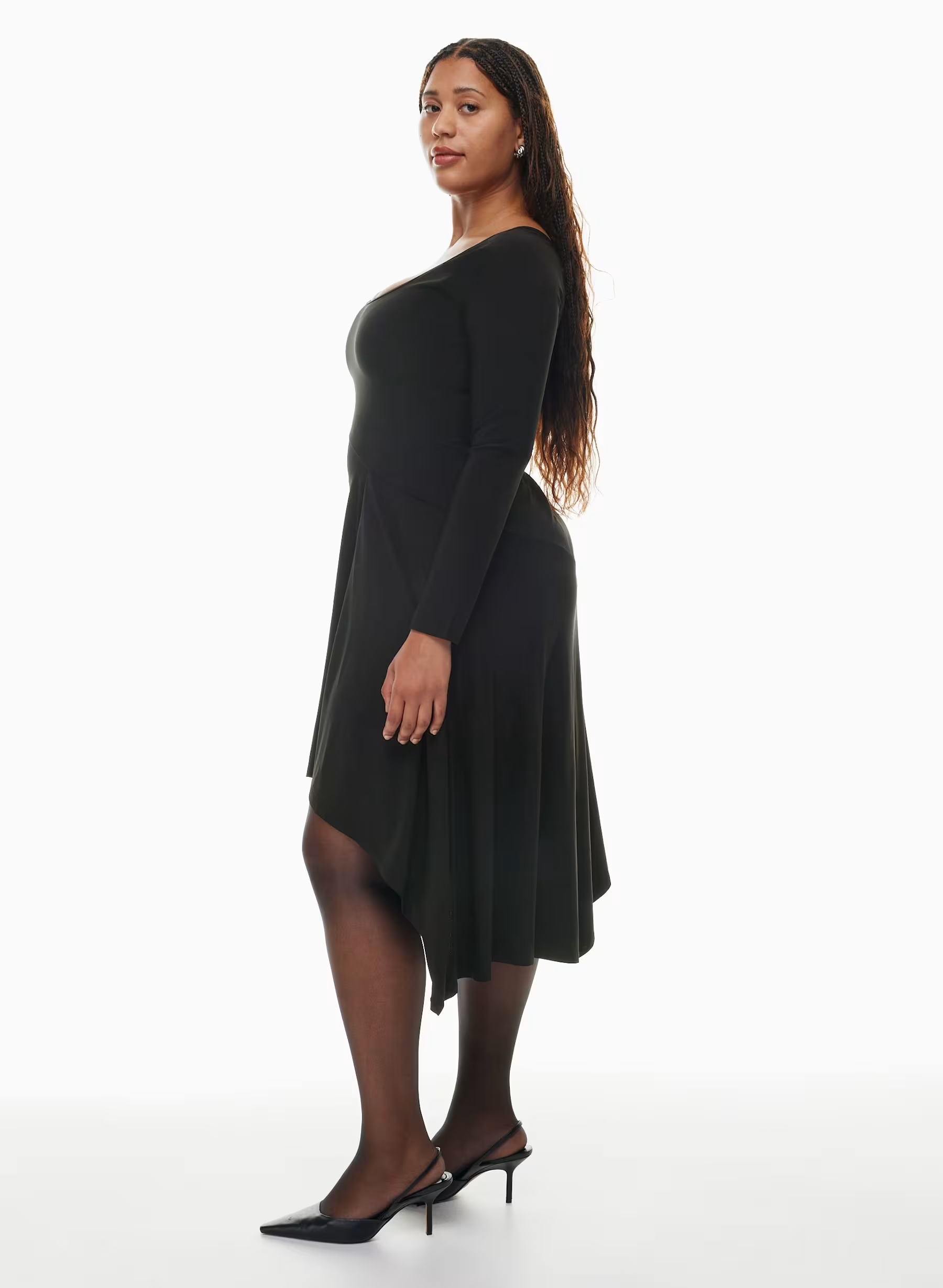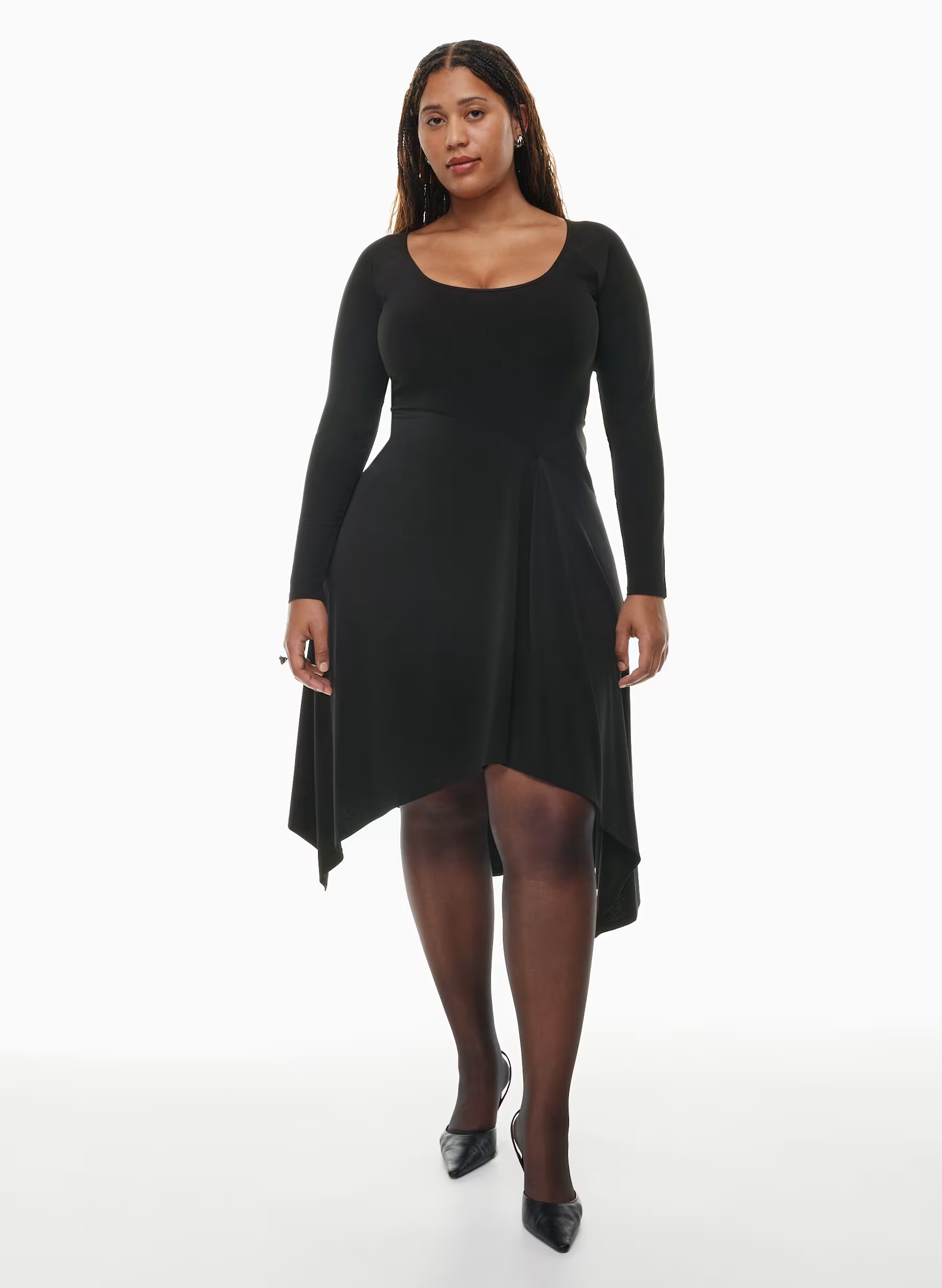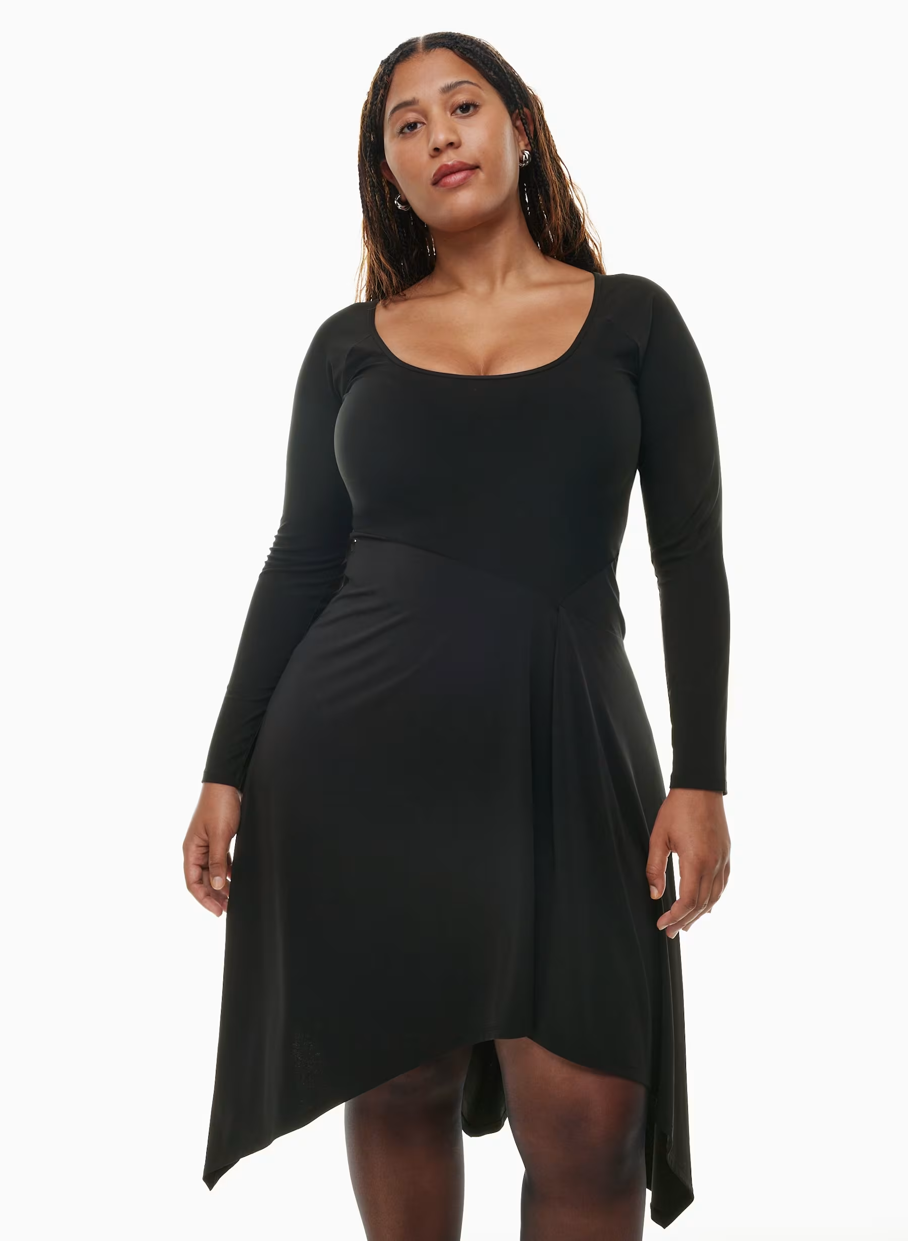 Details: Flamenco, anyone? This is a fit-and-flare dress with long sleeves, a scoop neckline and a handkerchief hem. It's cut from second-skin stretch jersey with a luxe, sleek feel.